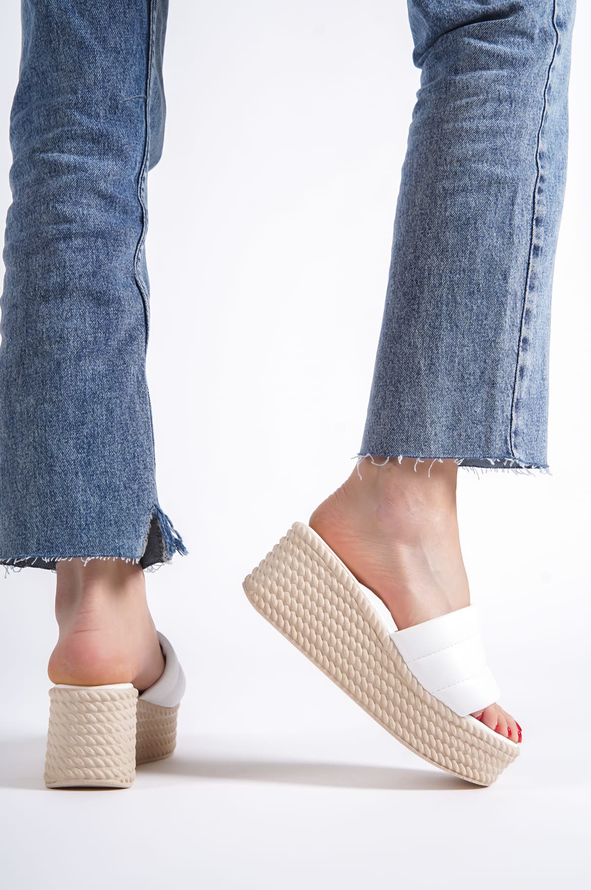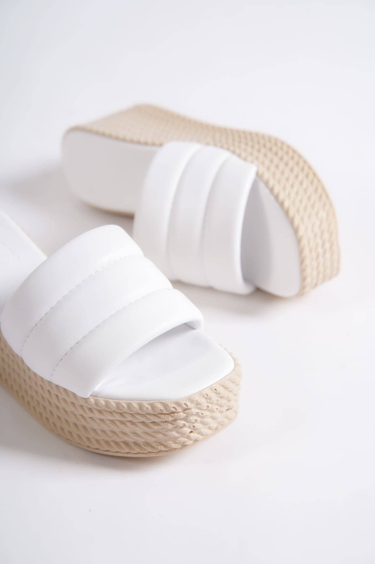 REINA Dolgu Topuklu Ortopedik Taban Hasır Görünümlü Kadın Terlik CKT – Beyaz