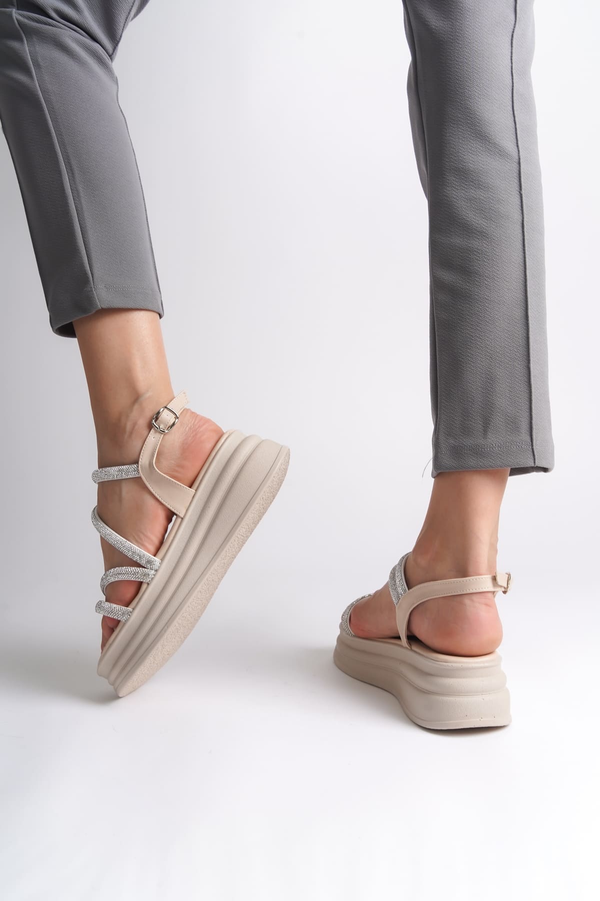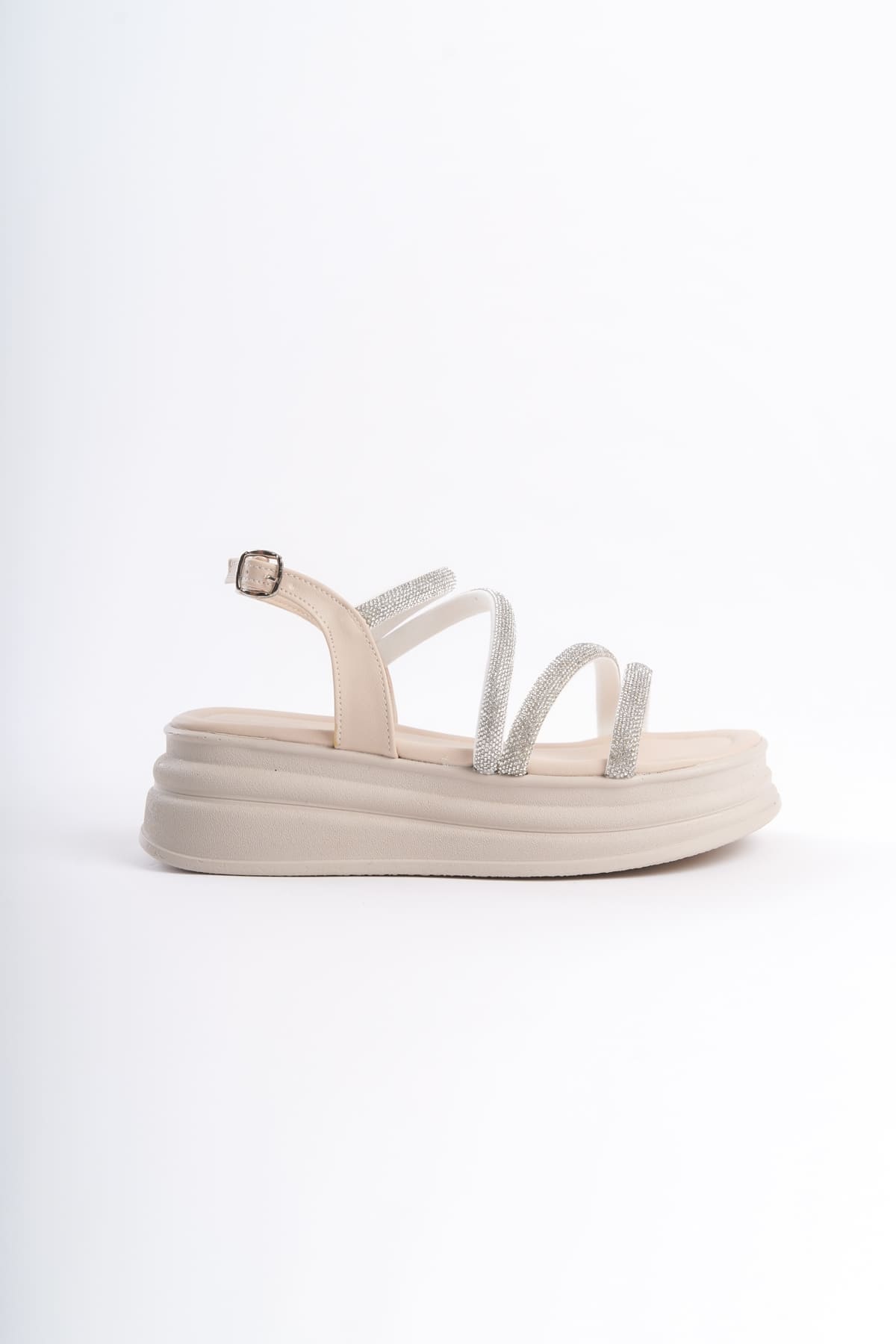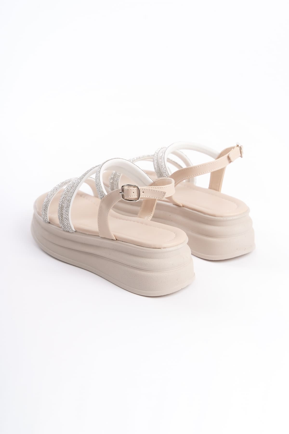 RILEY İnce Tokalı Taşlı Şeritli Ortopedik Taban Kadın Sandalet CKT – Krem