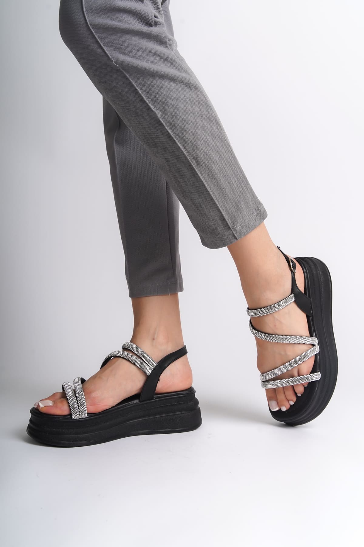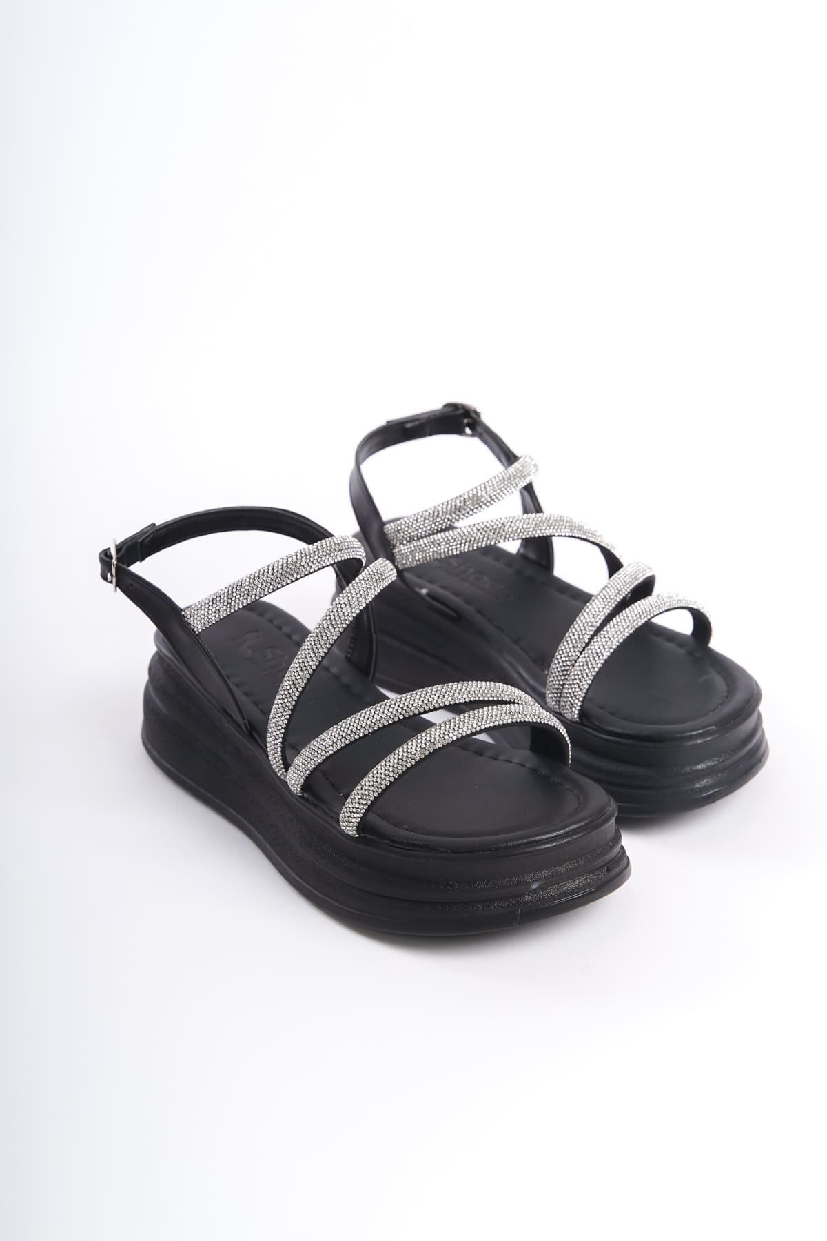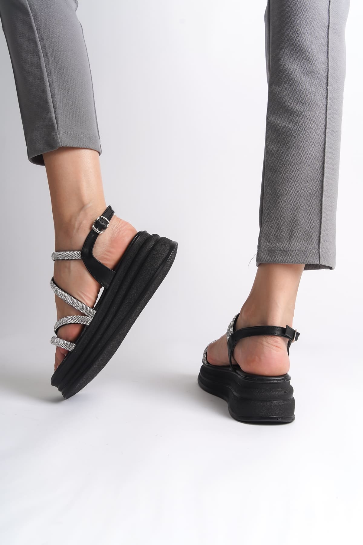 RILEY İnce Tokalı Taşlı Şeritli Ortopedik Taban Kadın Sandalet CST – Siyah