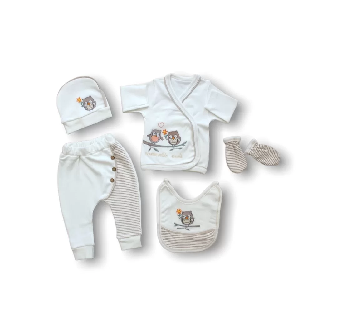 Romantik Çift Baykuş Nakışlı 5li Zıbın Takımı Hastane Çıkışı Ekru adet