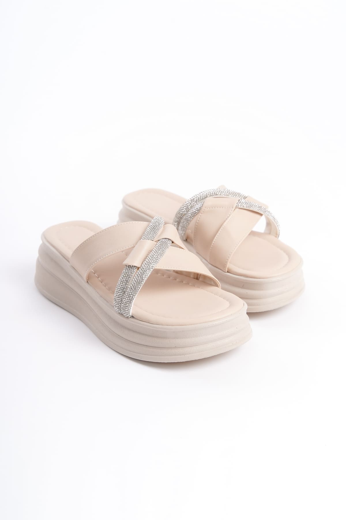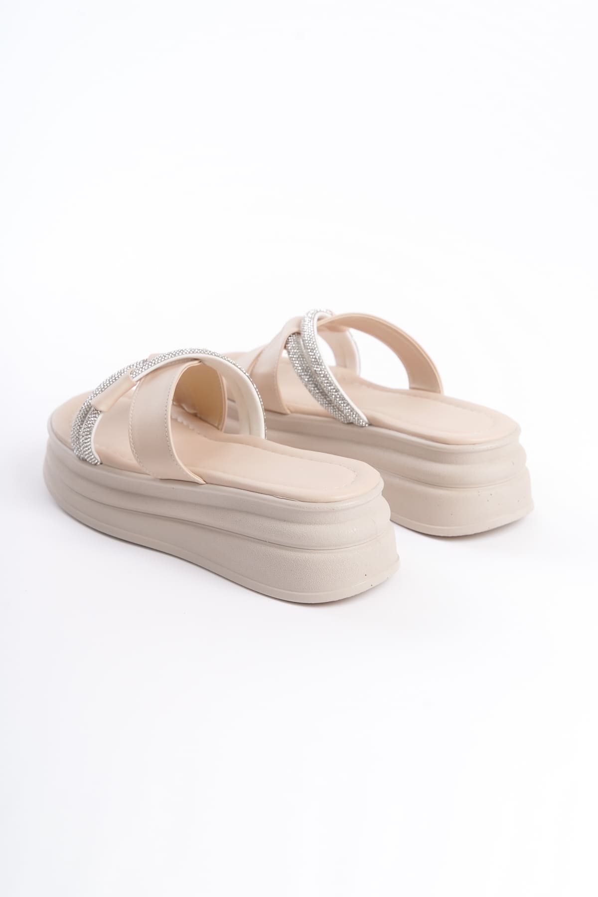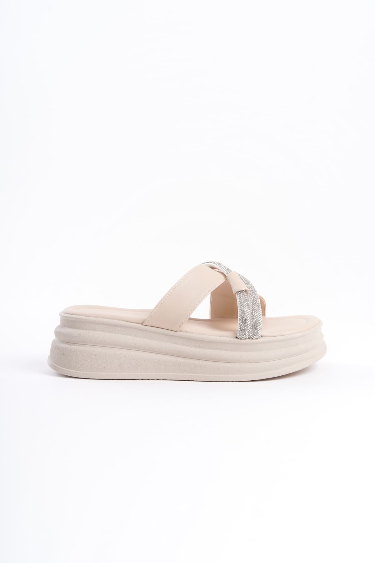 RUBY Düz Topuklu Taşlı Çapraz Şeritli Kalın ve Ortopedik Taban Kadın Terlik CKT – Krem