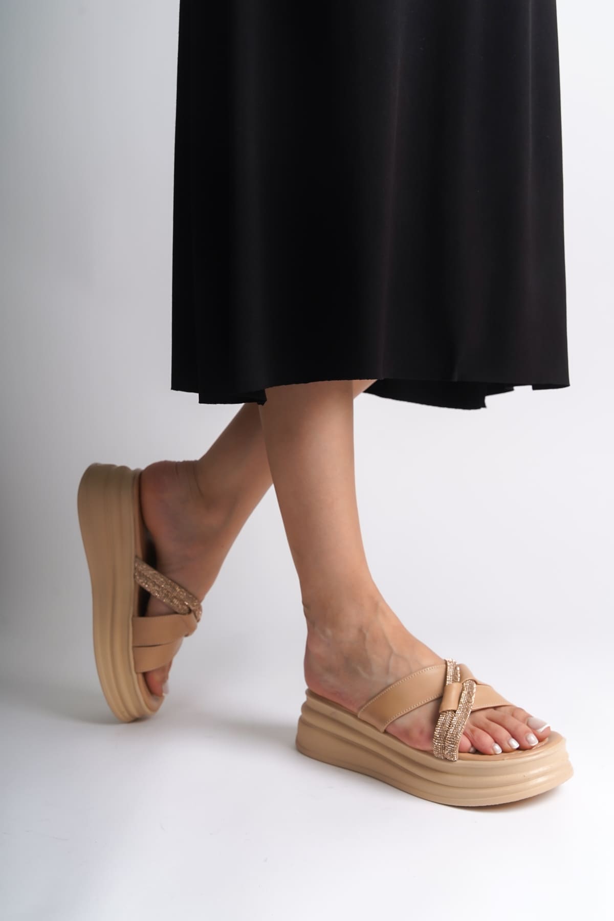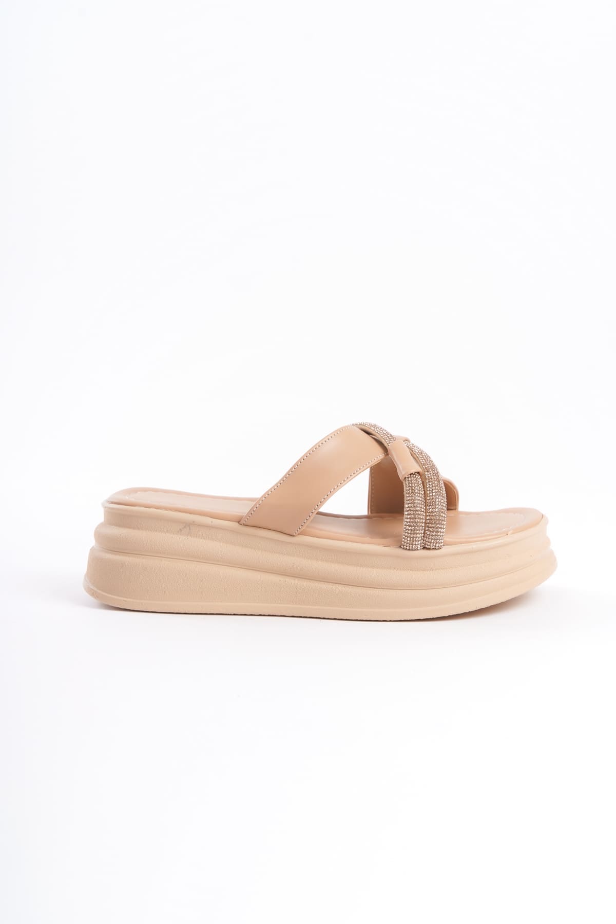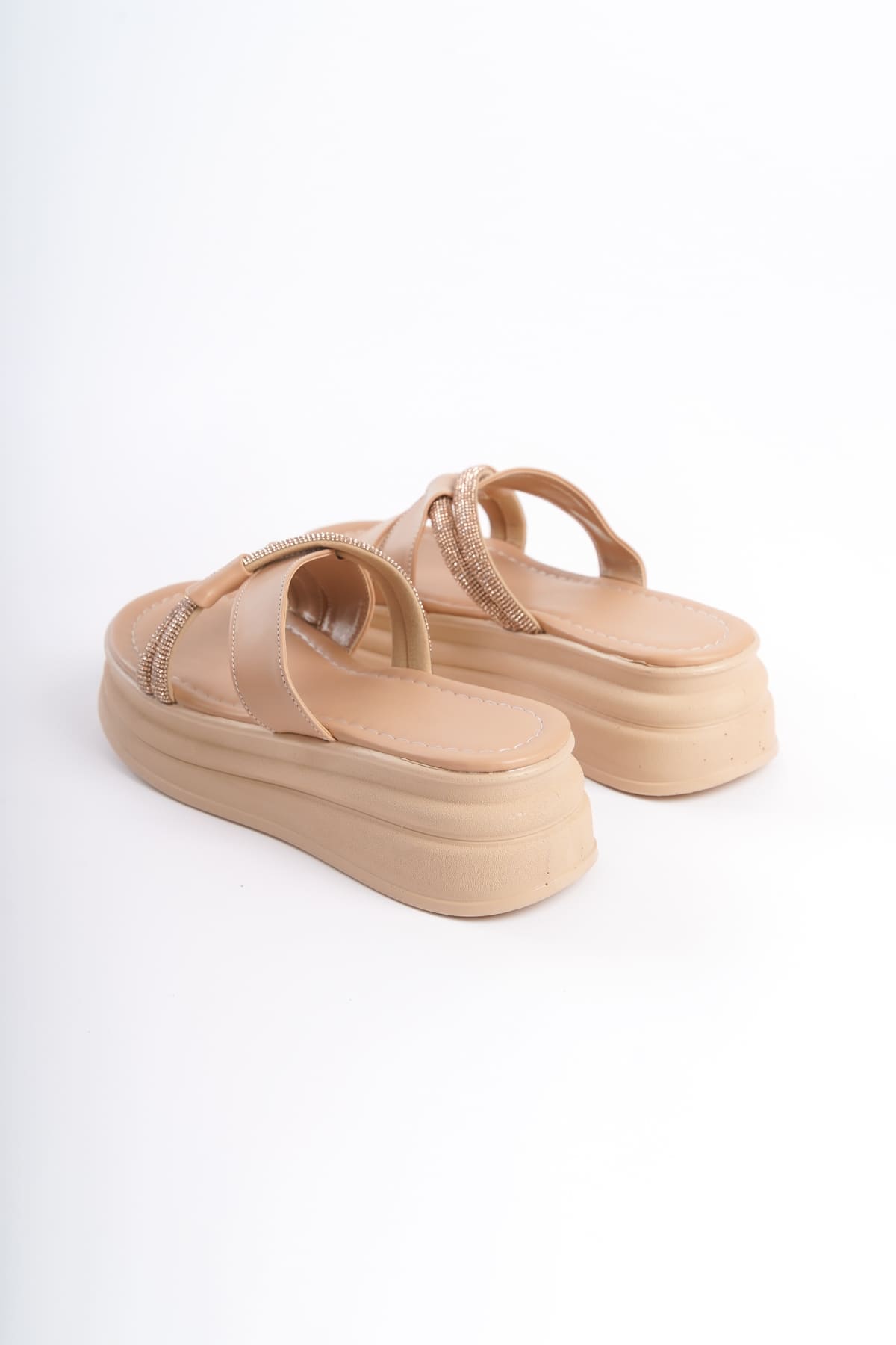 RUBY Düz Topuklu Taşlı Çapraz Şeritli Kalın ve Ortopedik Taban Kadın Terlik CTT – Ten