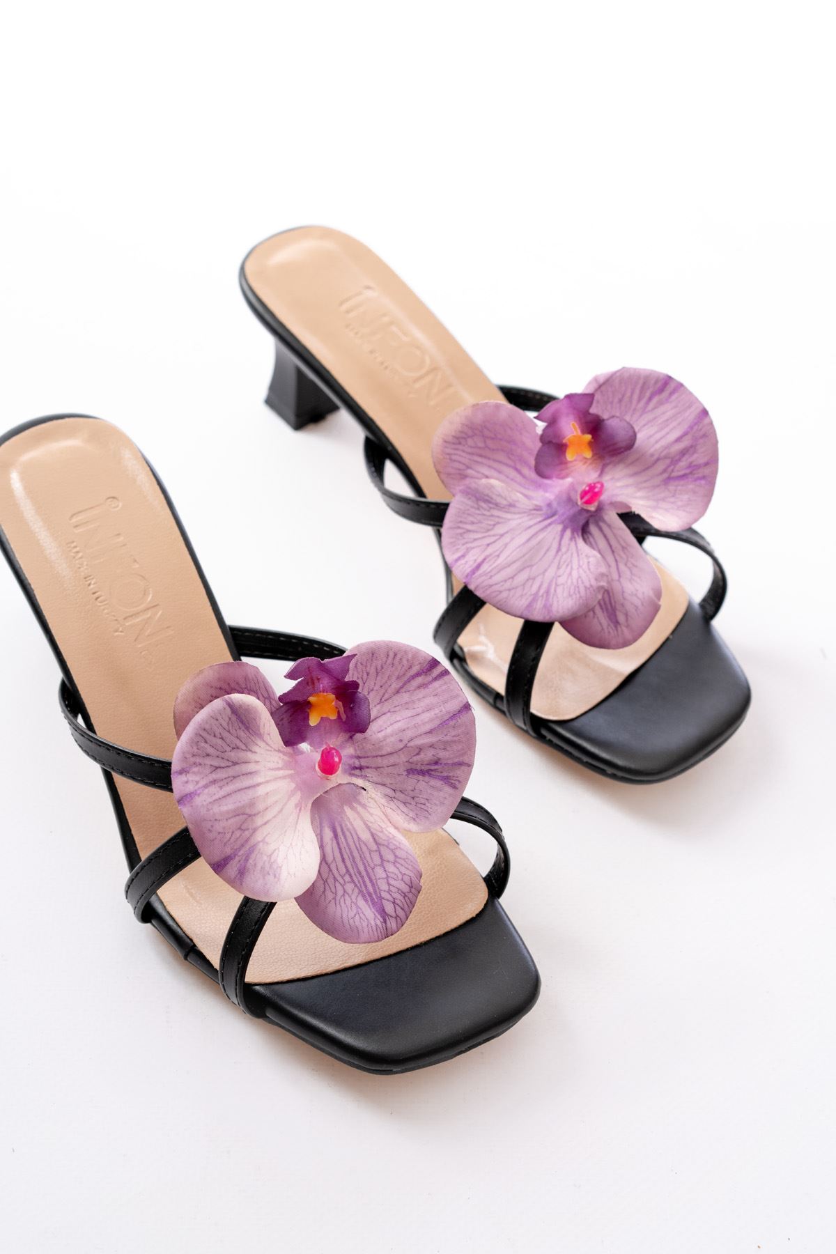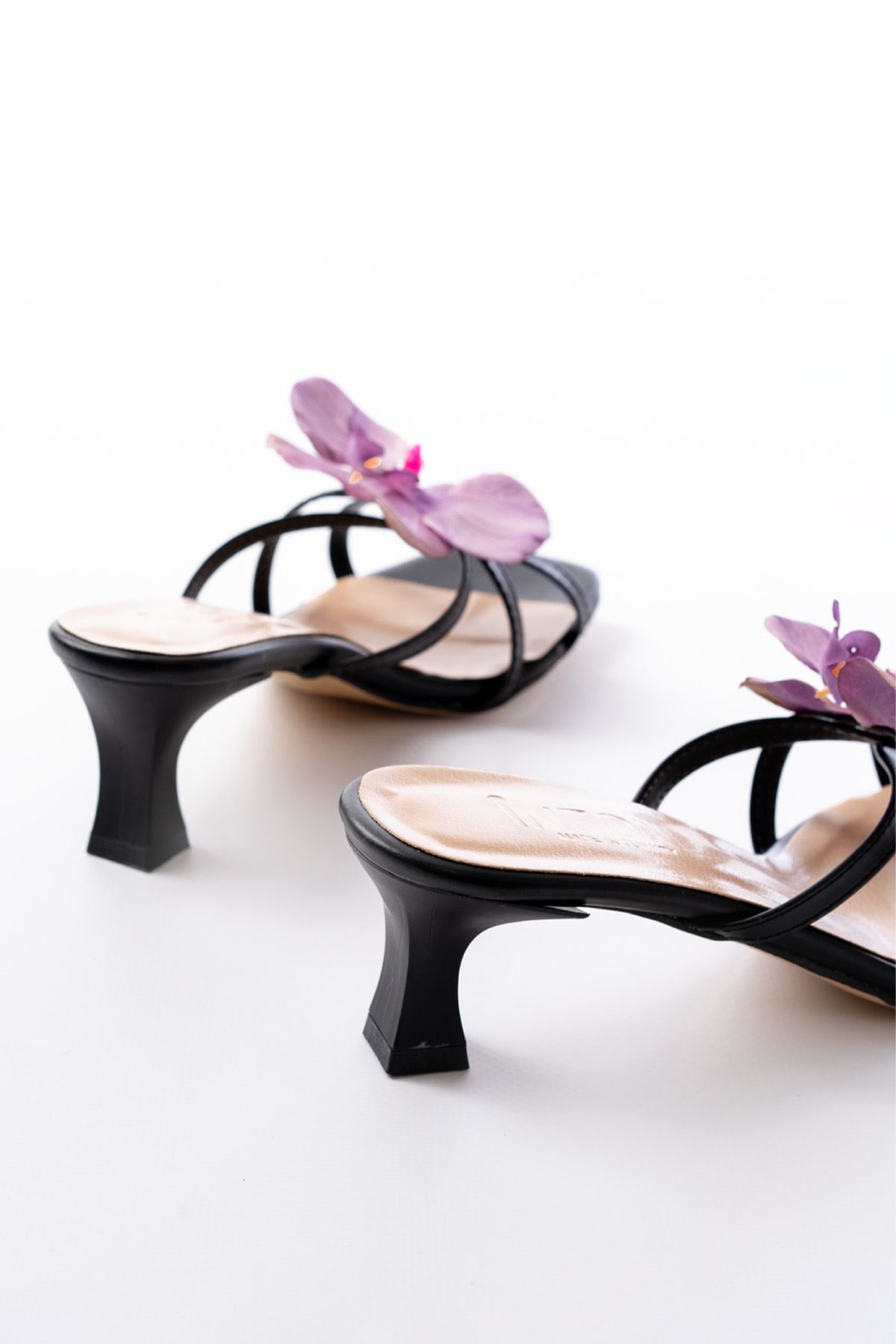 S-622 Siyah Mor Orkide Detaylı İnce Topuklu Kadın Terlik