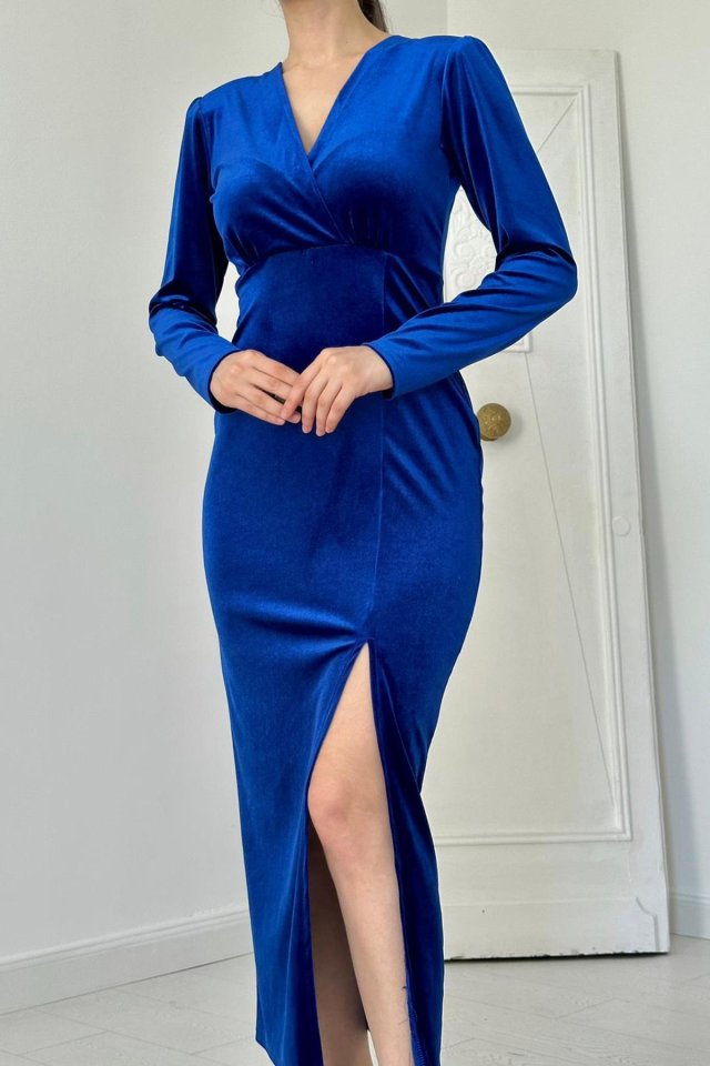 Saks Eteği Yırtmaçlı Kadife Elbise