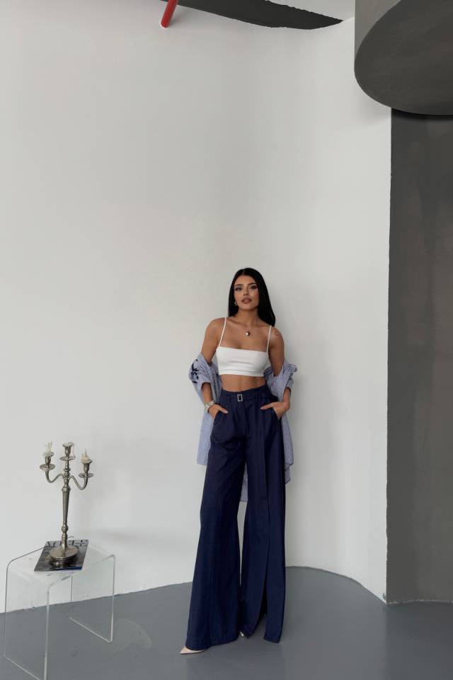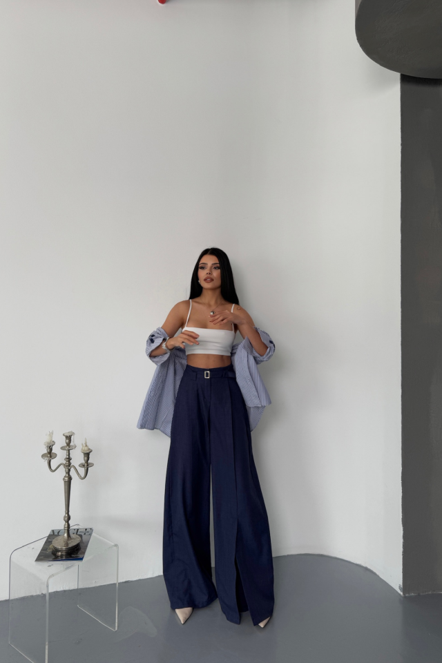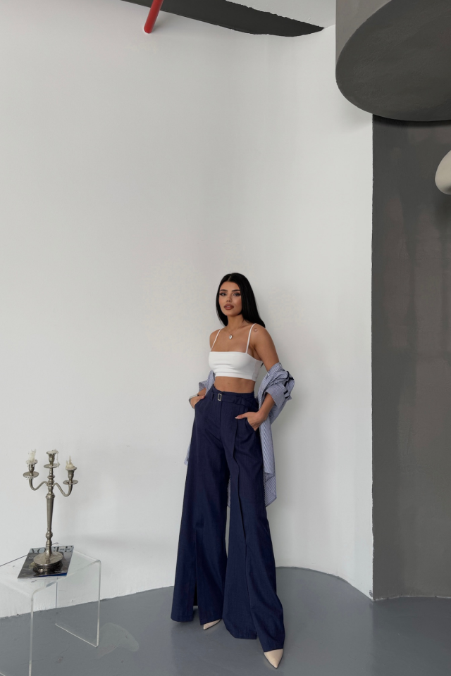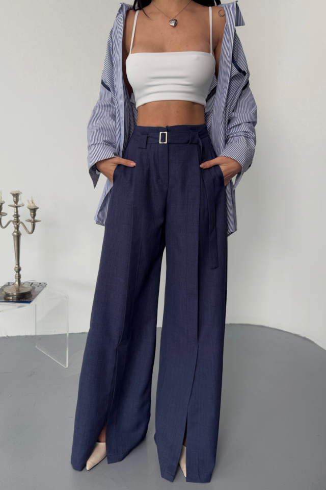 SALAŞ ÖNDEN YIRTMAÇ DETAYLI BEL KEMERLİ PANTOLON – Lacivert