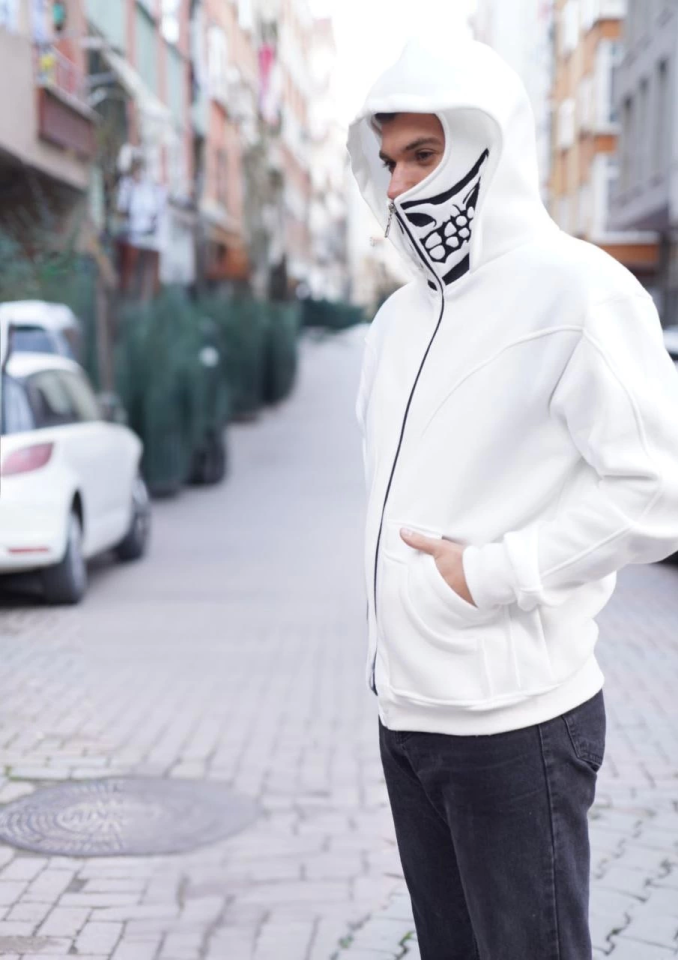 Samuray Kapşonlu ZIP Fermuarlı Çift Kapşonlu Nakışlı SweatShirt- Beyaz