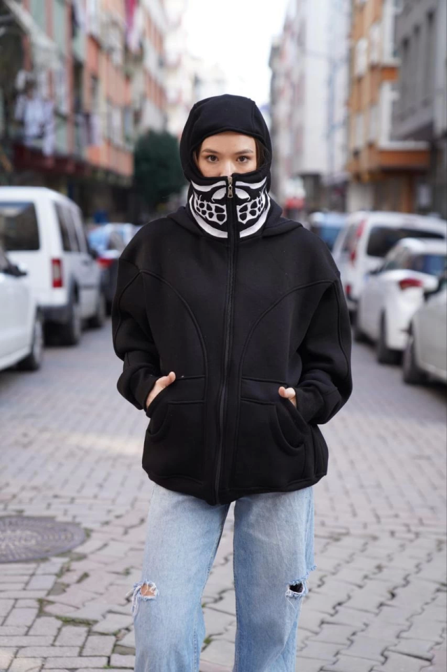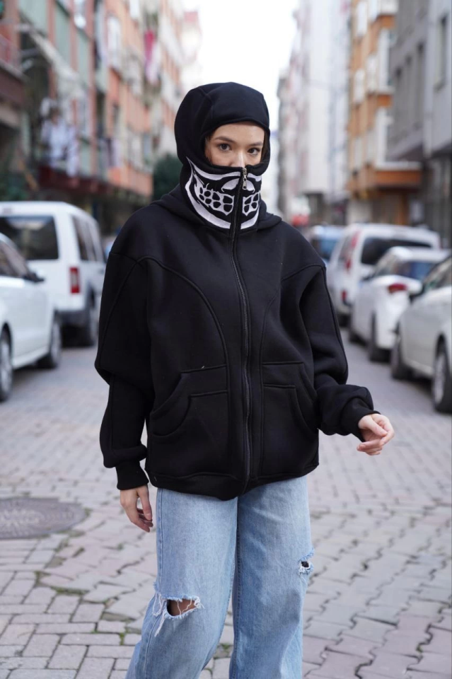 Samuray Kapşonlu ZIP Fermuarlı Çift Kapşonlu Nakışlı SweatShirt- Siyah