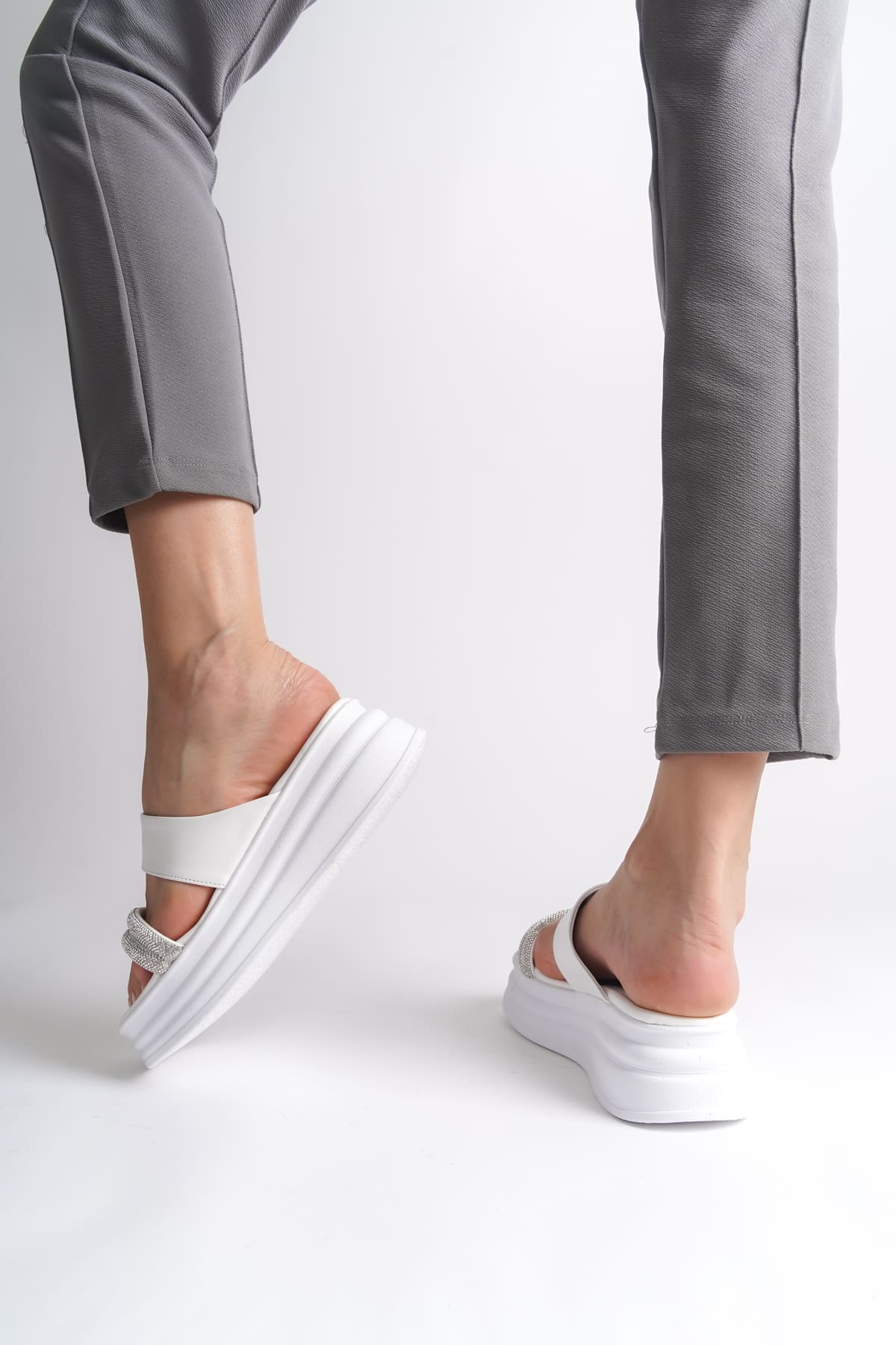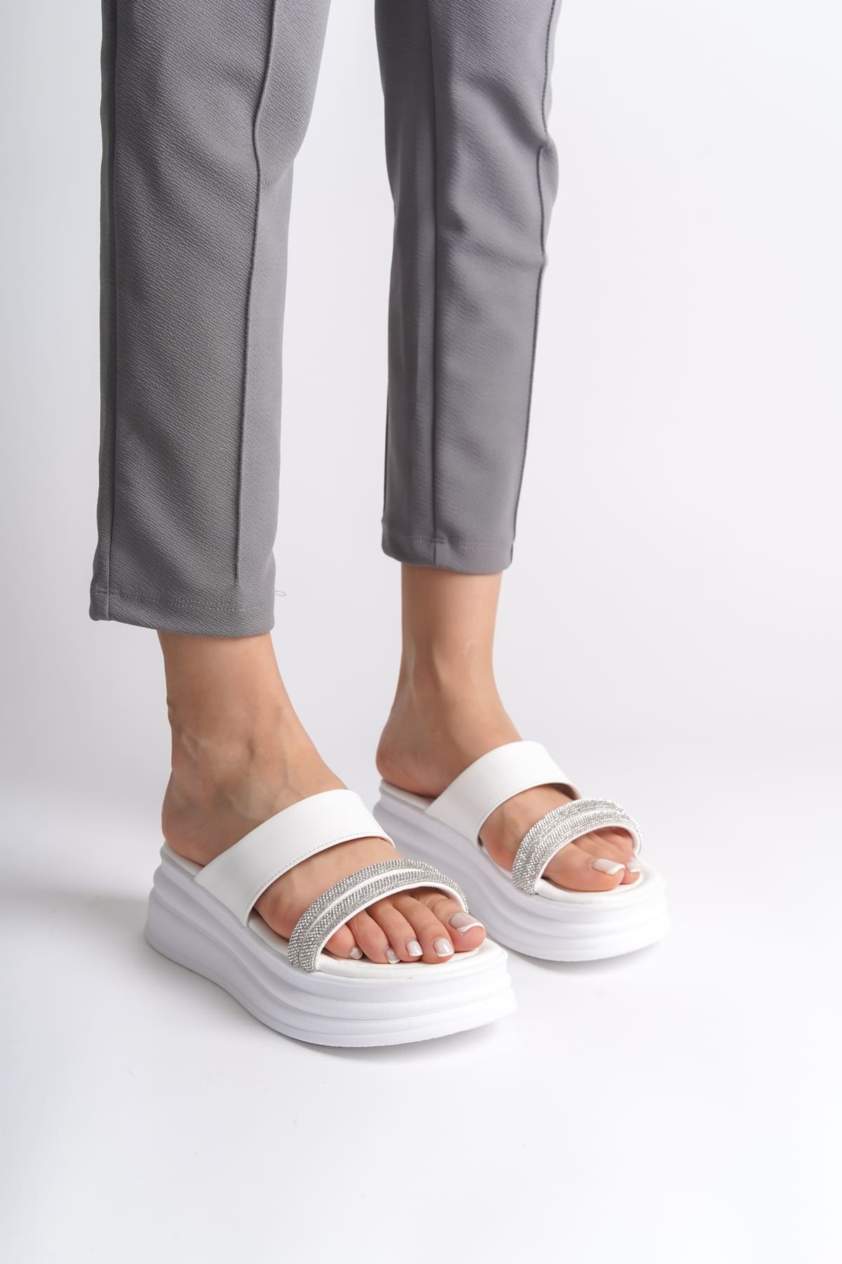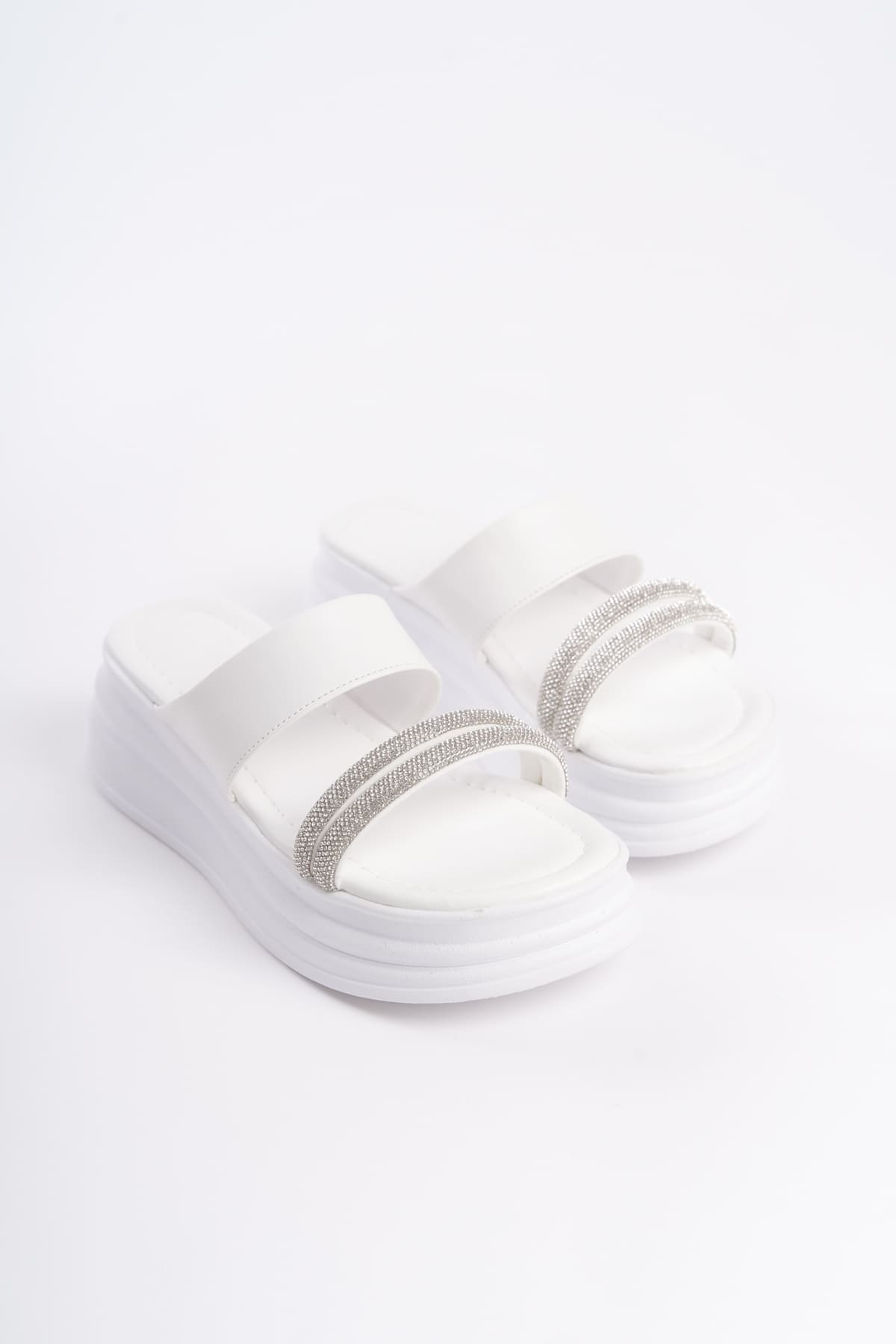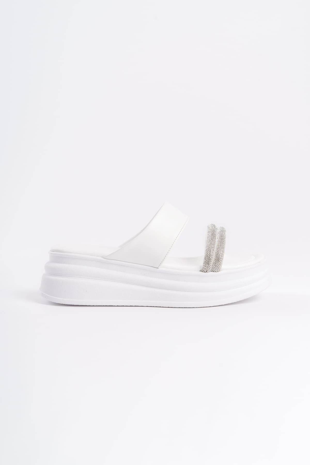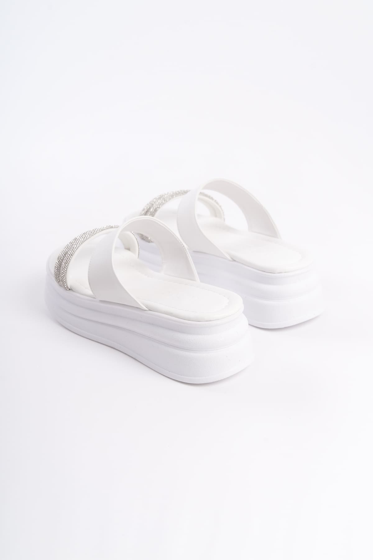 SARAH Düz Topuklu Taşlı Şeritli Kalın ve Ortopedik Taban Kadın Terlik CBT – Beyaz