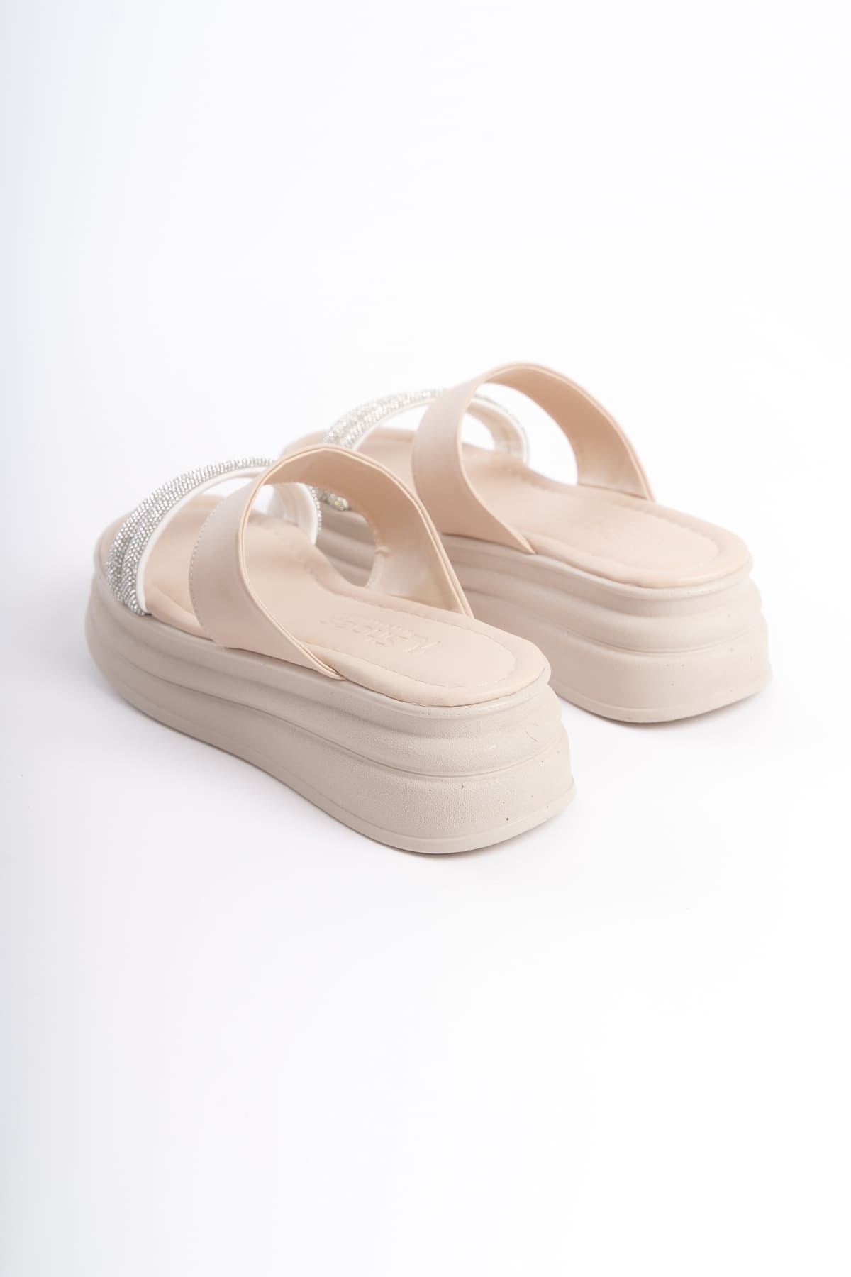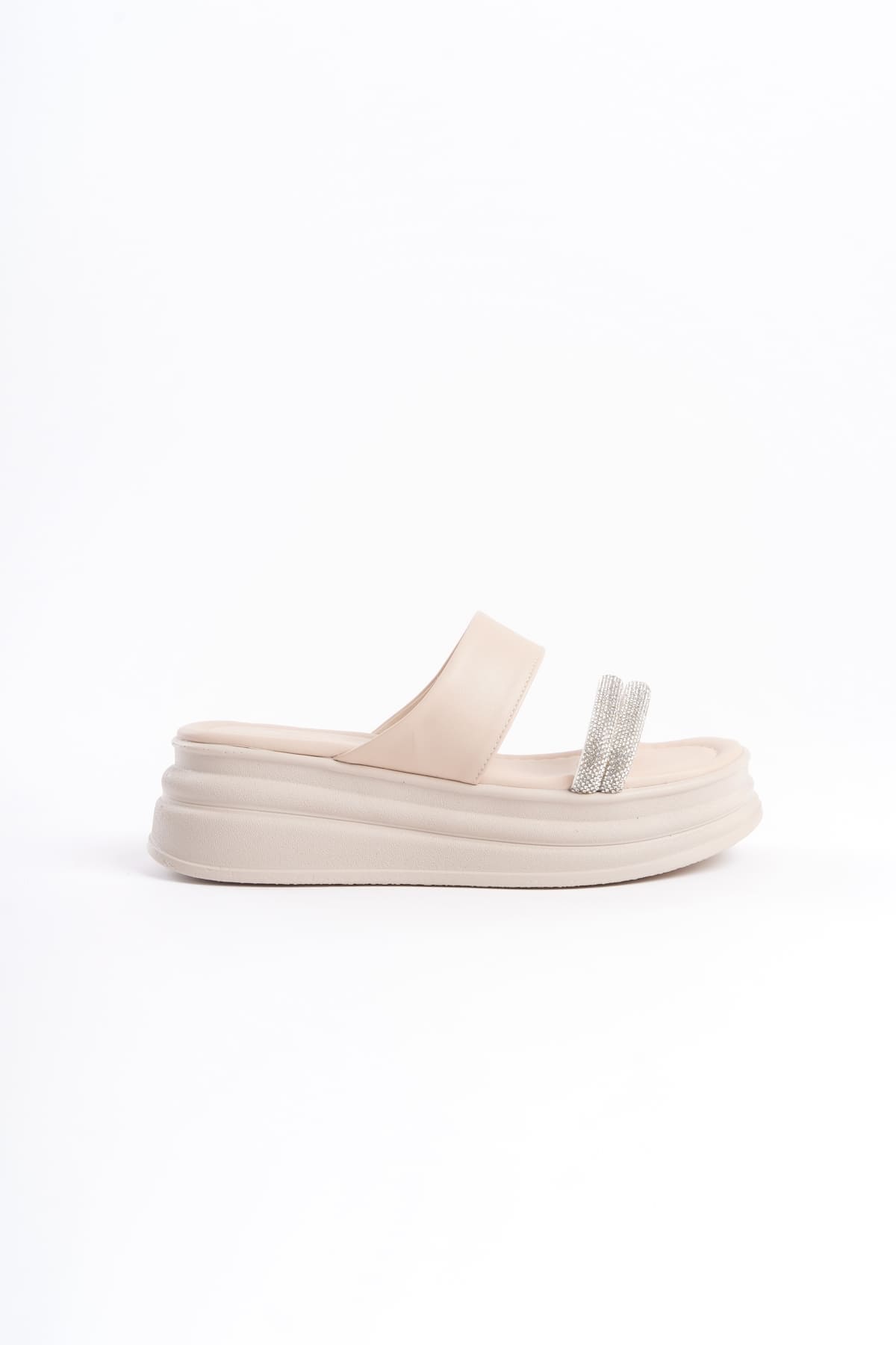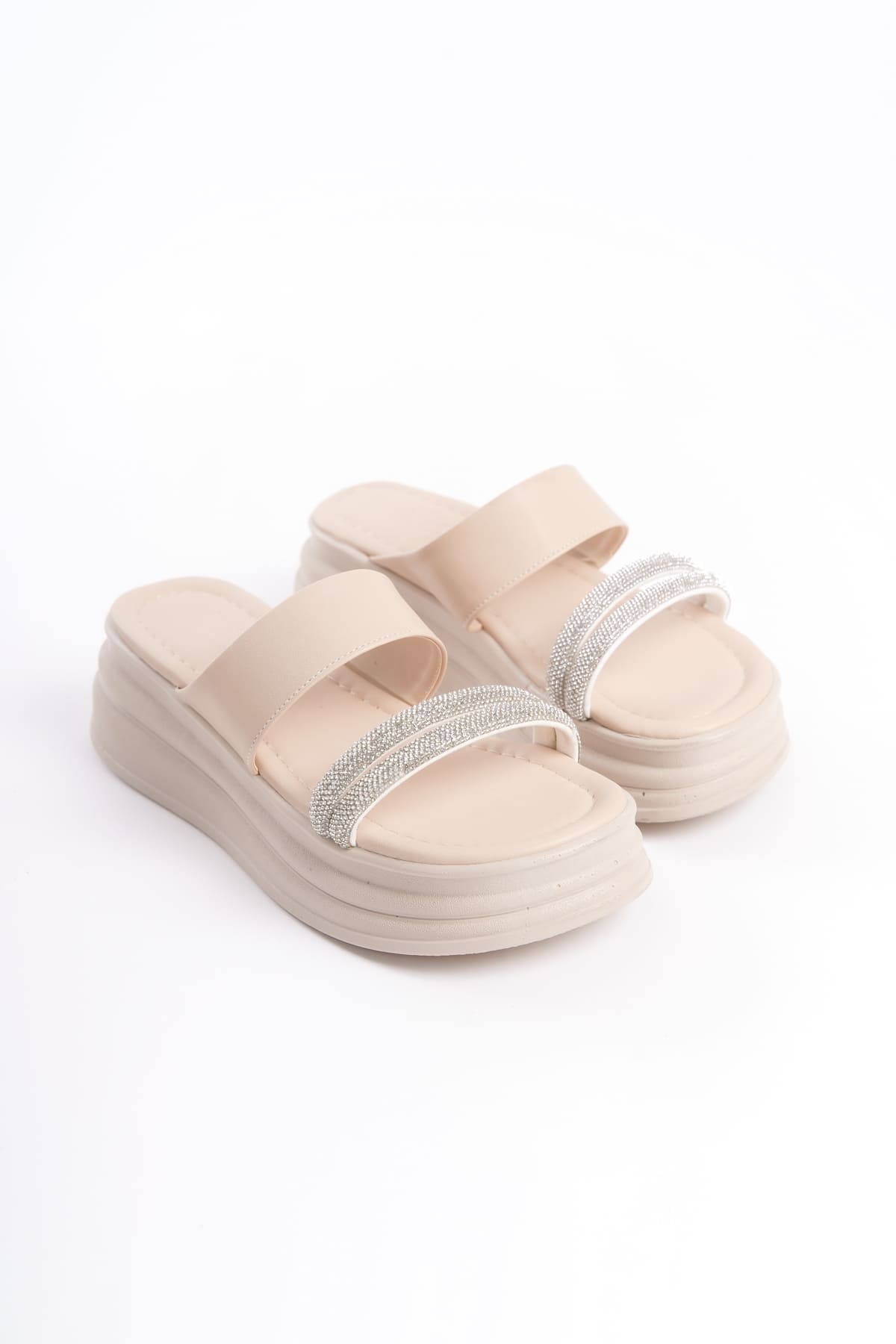 SARAH Düz Topuklu Taşlı Şeritli Kalın ve Ortopedik Taban Kadın Terlik CKT – Krem