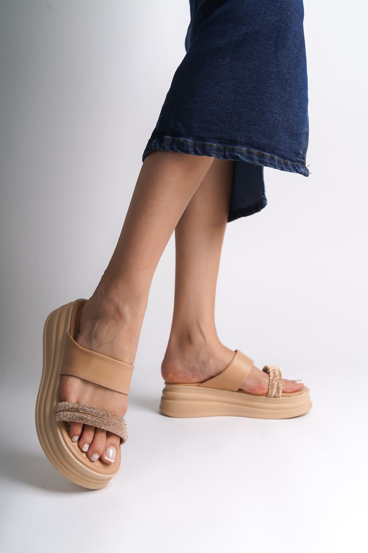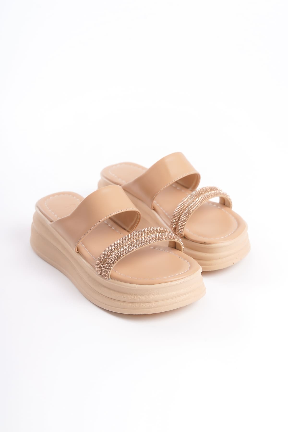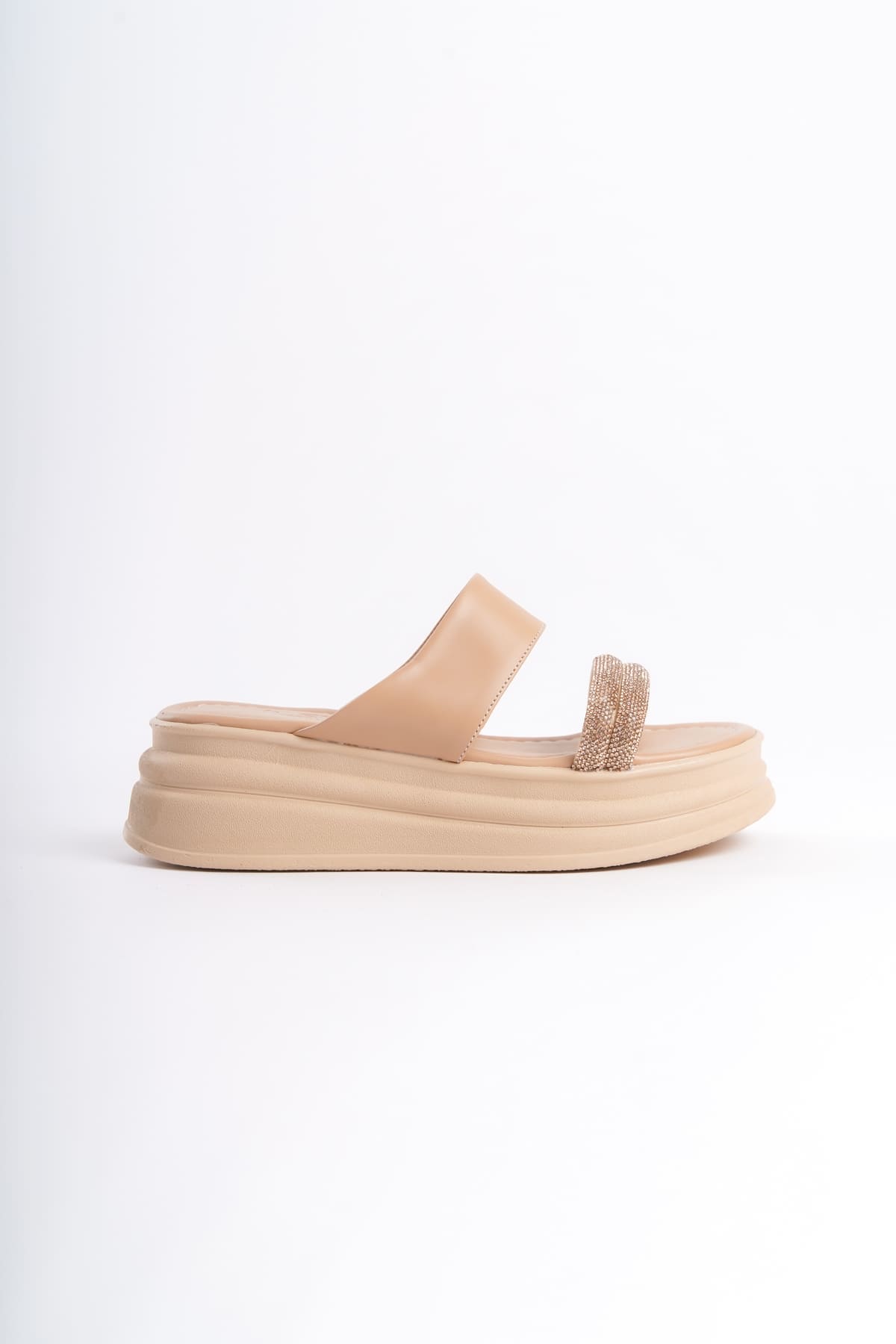 SARAH Düz Topuklu Taşlı Şeritli Kalın ve Ortopedik Taban Kadın Terlik CTT – Ten