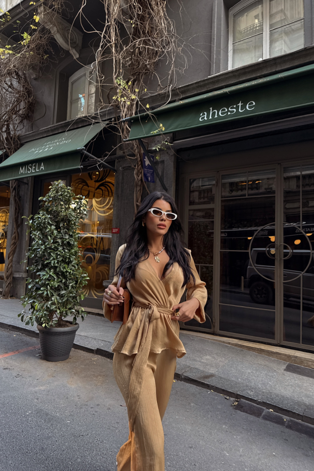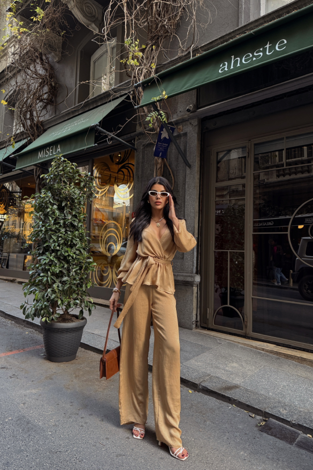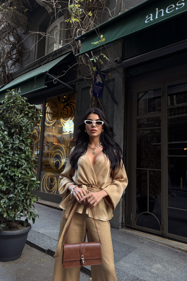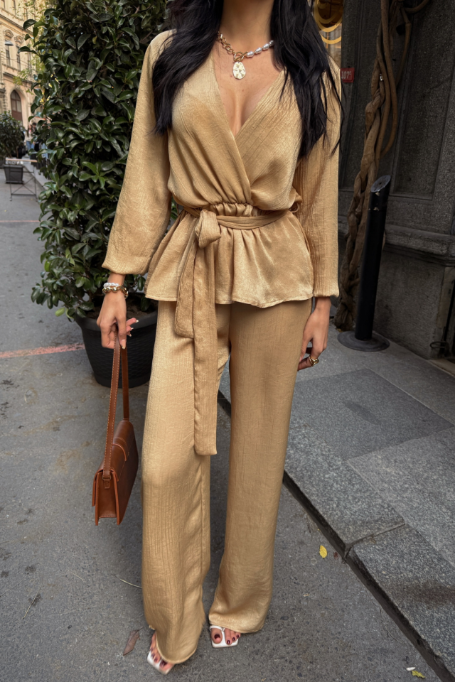 SATEN KRUVAZE BAĞLAMALI BLUZ- PANTOLON TAKIM – Bej