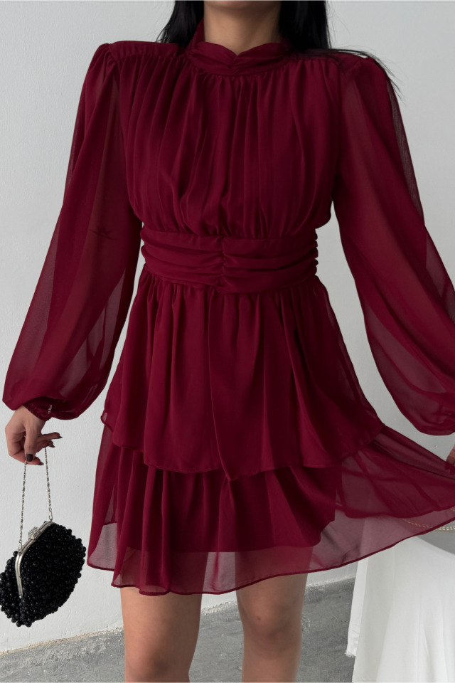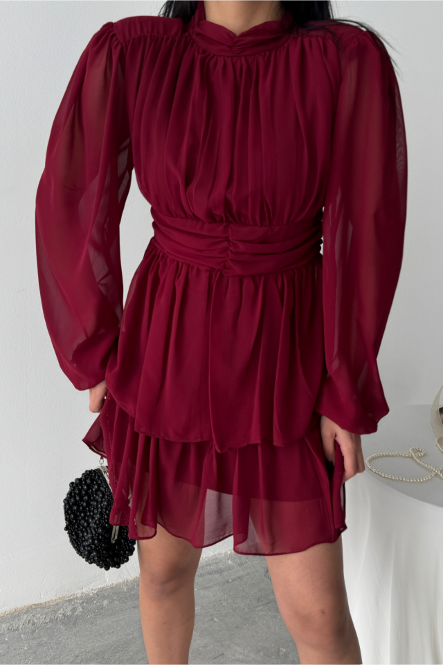 ŞİFON KATLI UZUN KOL ELBİSE – Bordo