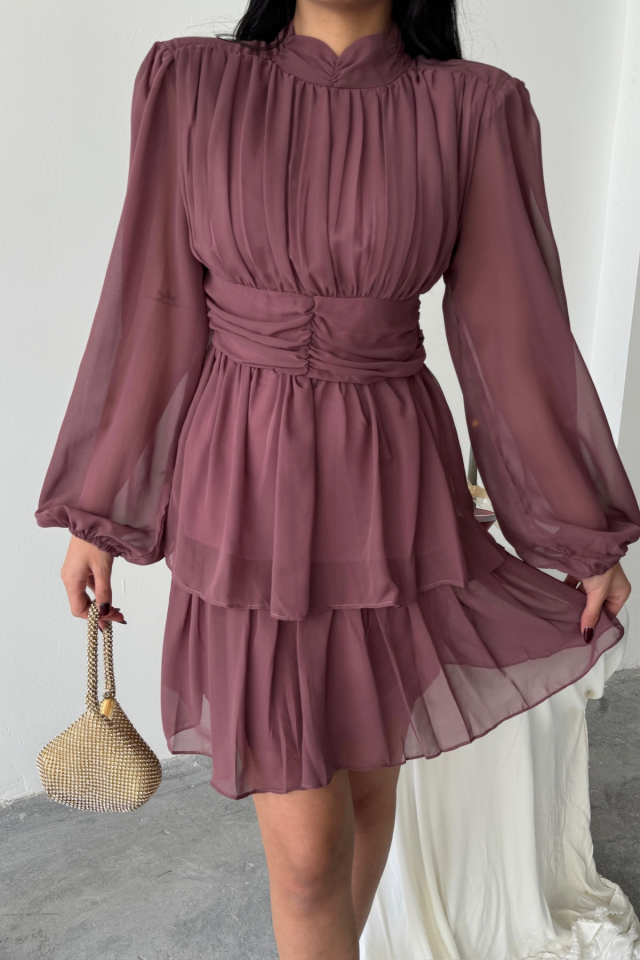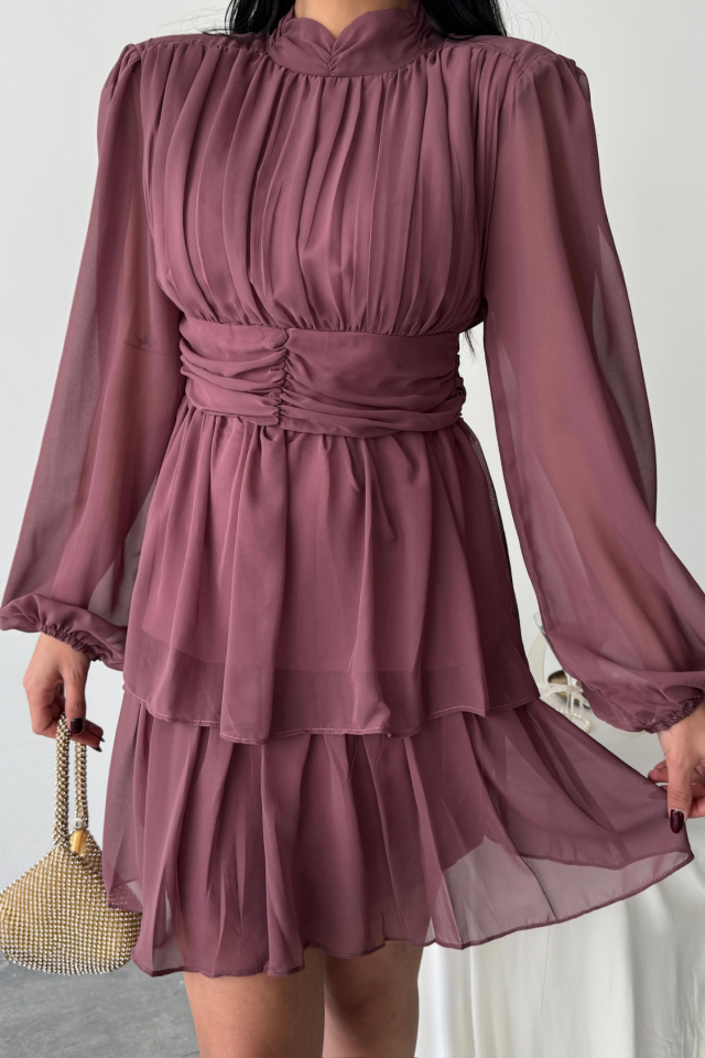 ŞİFON KATLI UZUN KOL ELBİSE – Pudra