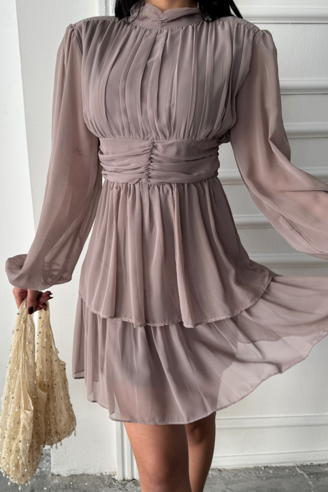 ŞİFON KATLI UZUN KOL ELBİSE – Vizon