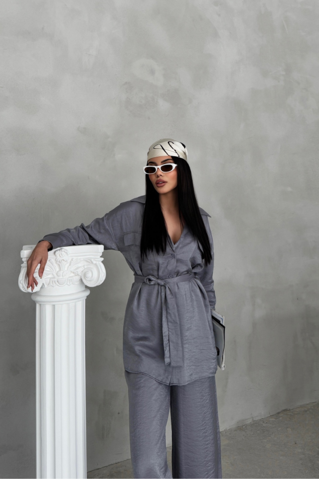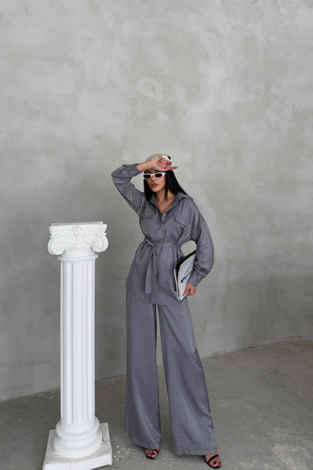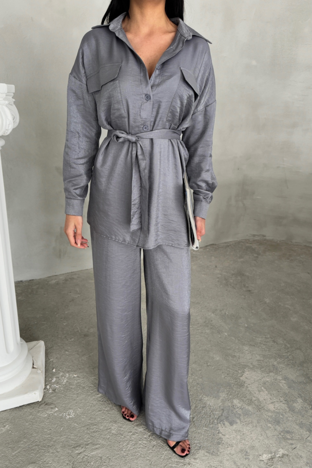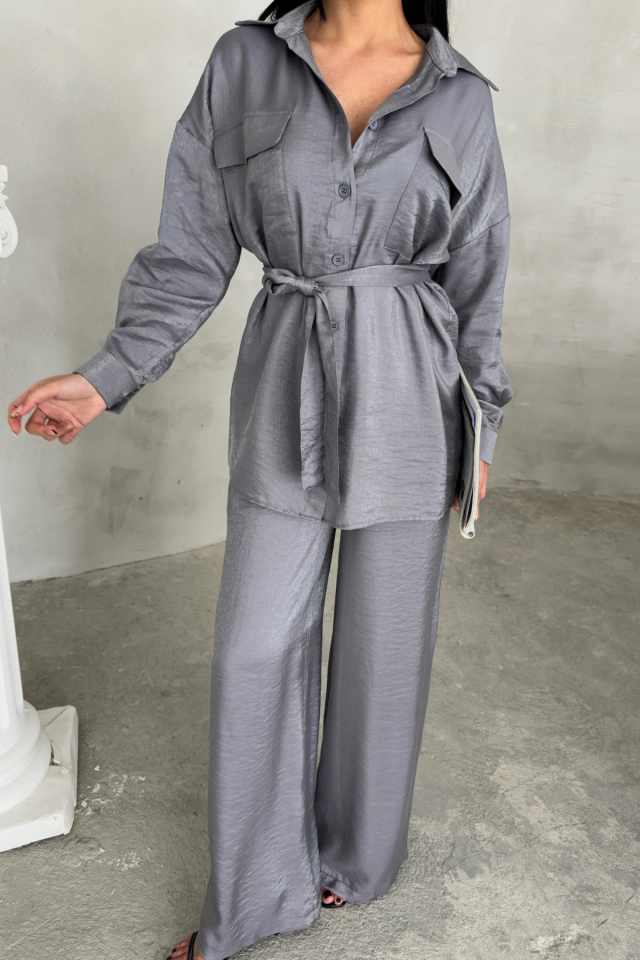 SİMLİ KUMAŞ SALAŞ PANTOLON – GÖMLEK TAKIM – Gri
