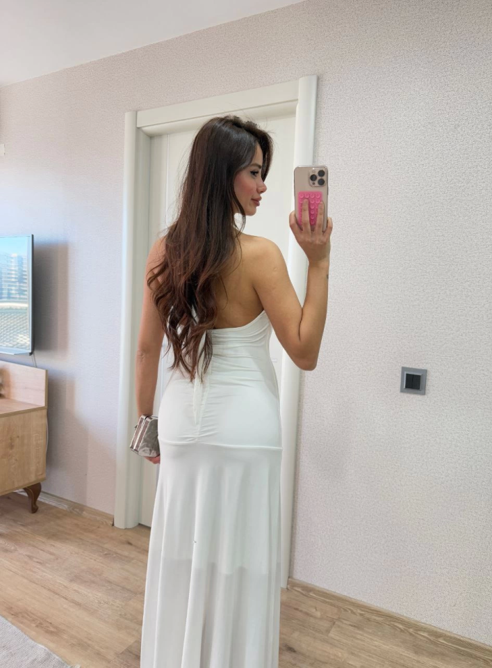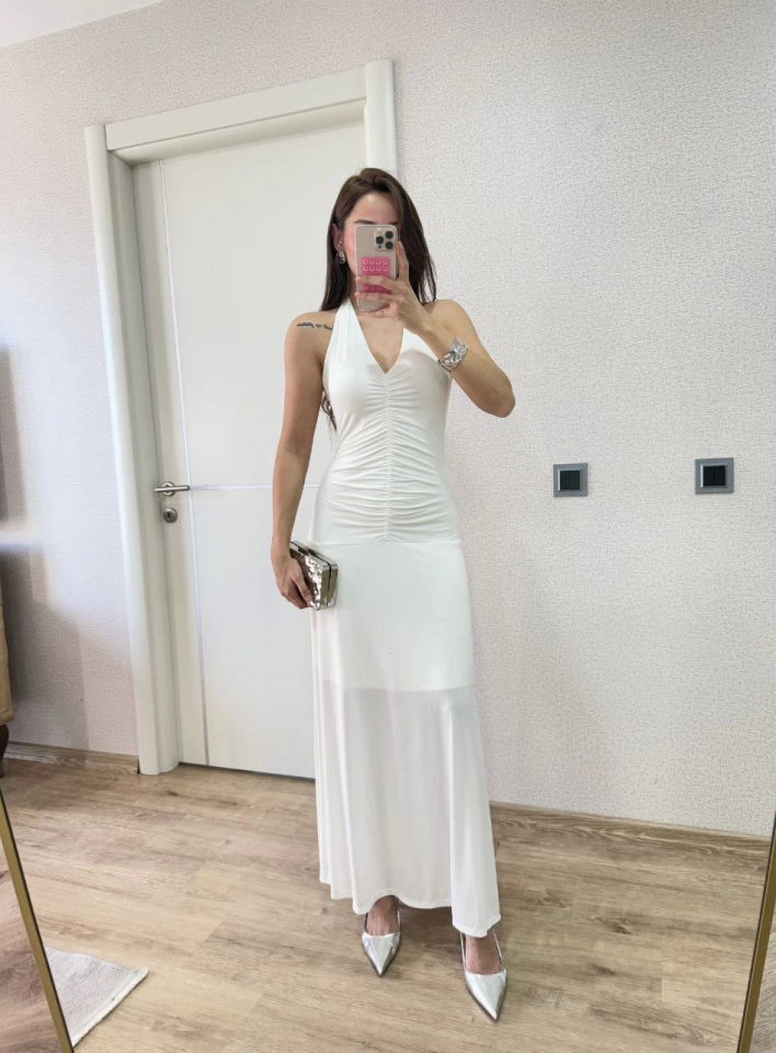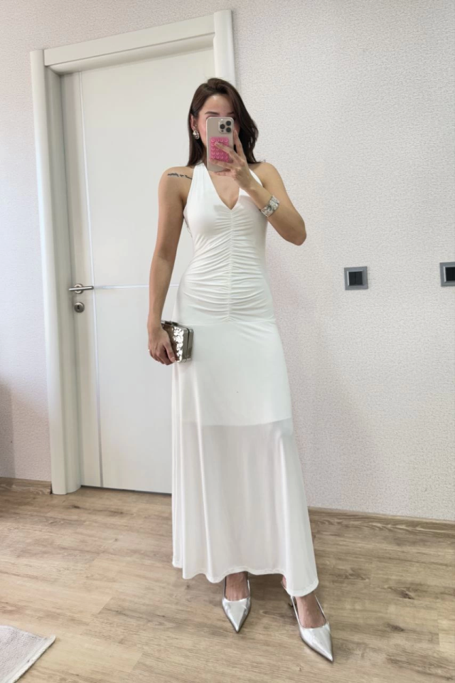 Sırt Dekolteli Uzun Kollu Elbise – Beyaz
