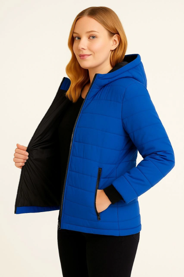 Şişme Kapüşonlu Fermuarlı Mont Su Itici Kapitone Astarlı Kumaş Cepli Kışlık Rahat Kalıp – Saks Mavisi