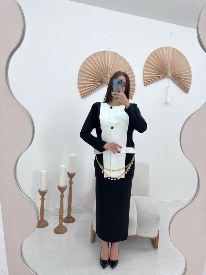 Siyah Atlas Kumaş Garnili Ceket Ve Etek Takım