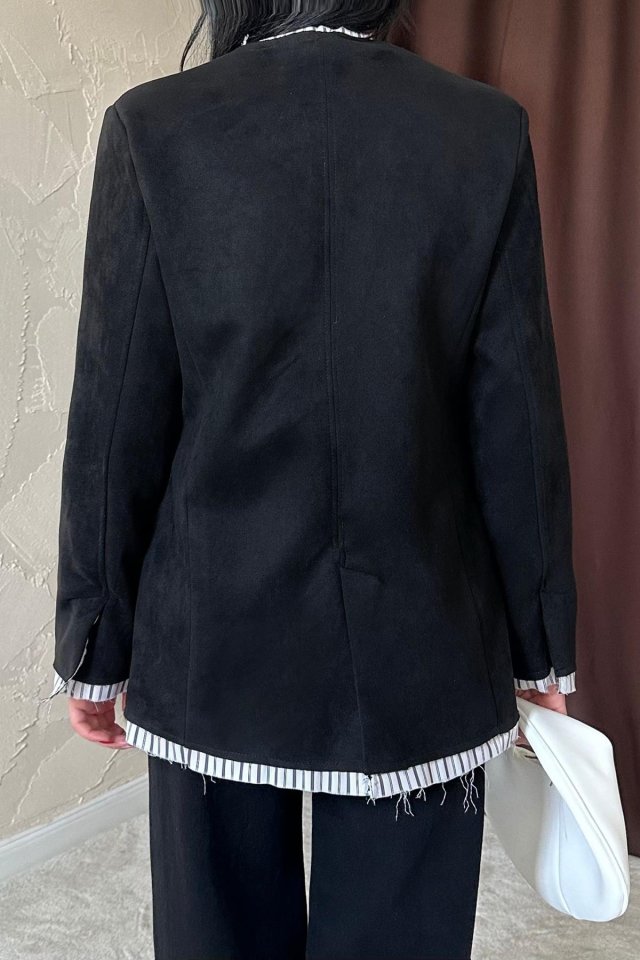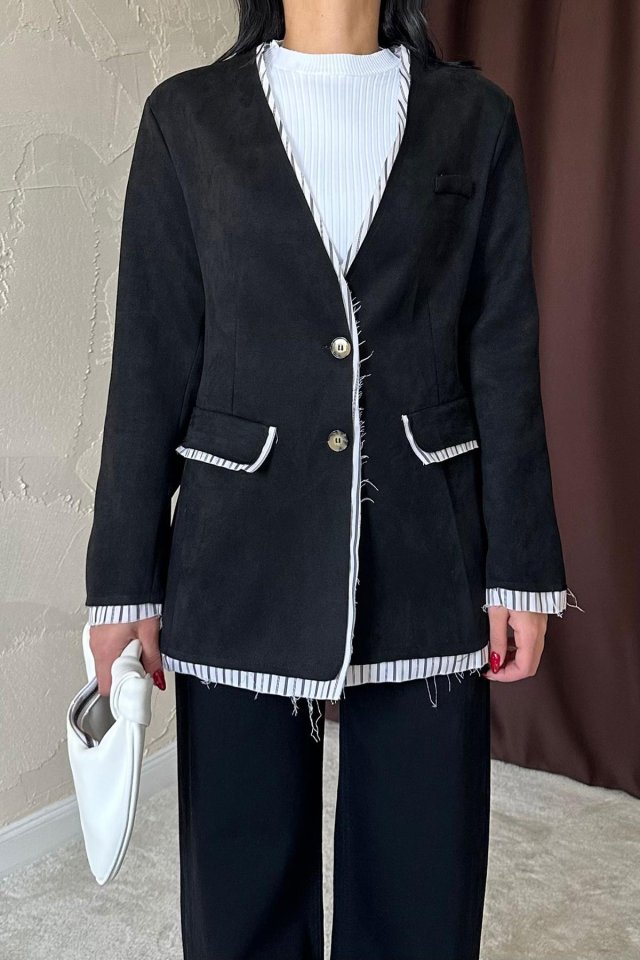Siyah Çizgili Astarlı Garnili Süet Ceket