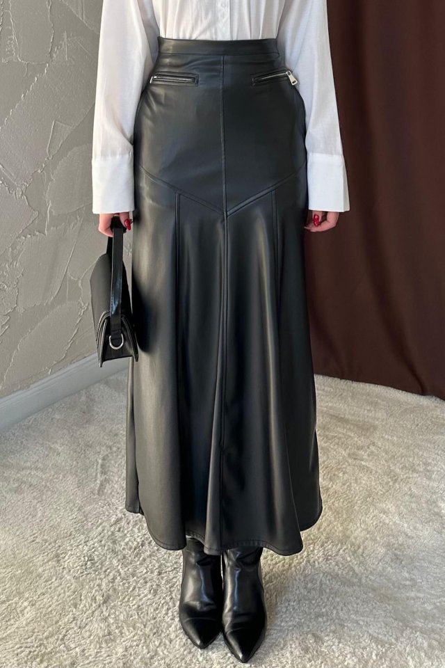 Siyah Fermuar Detaylı Deri Etek