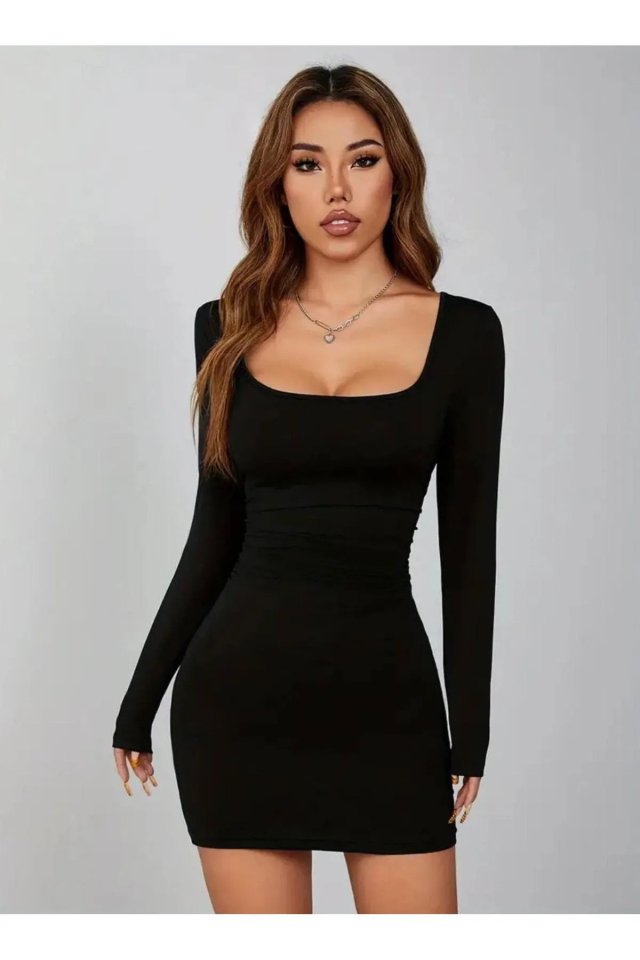 Siyah Kare Yaka Uzun Kollu Likralı Mini Elbise