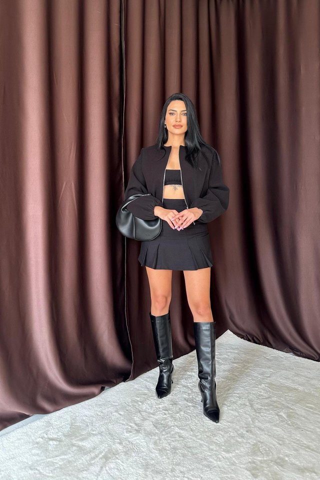 Siyah Kısa Önü Fermuarlı Bomber Ceket