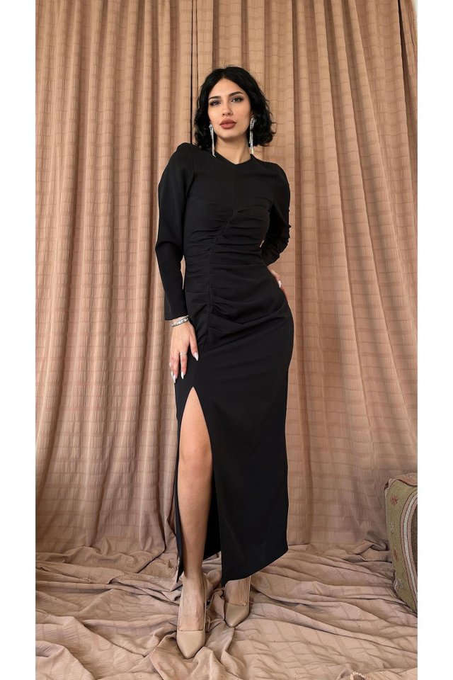 Siyah Pileli Yıtmaçlı Uzun Elbise