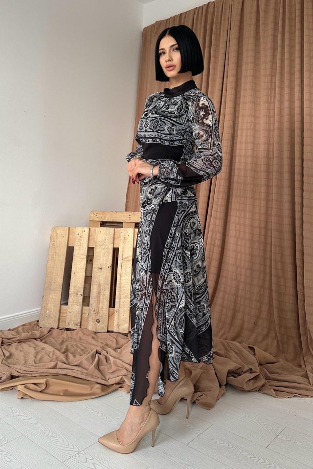 Siyah Reglan Kol Parçalı Baskılı Elbise