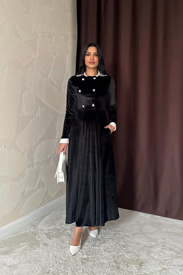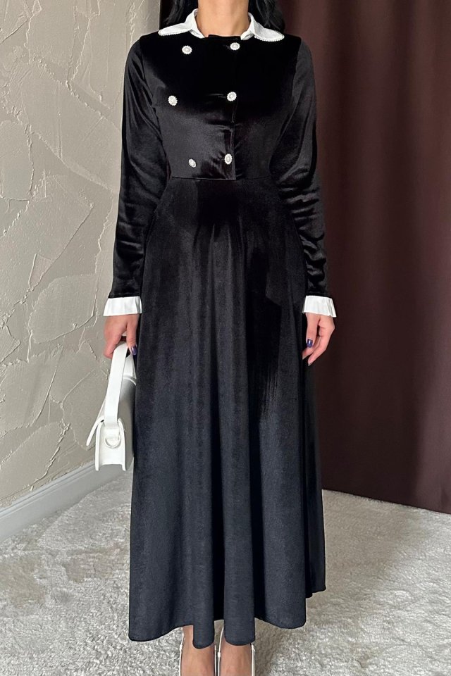 Siyah Yakası Taşlı Garnili Kadife Elbise