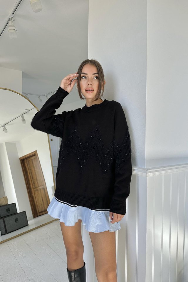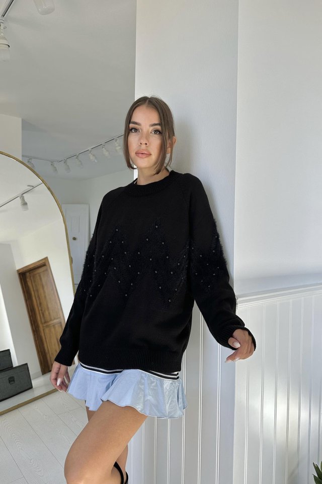 Siyah Zikzak Boncuklu Triko Kazak