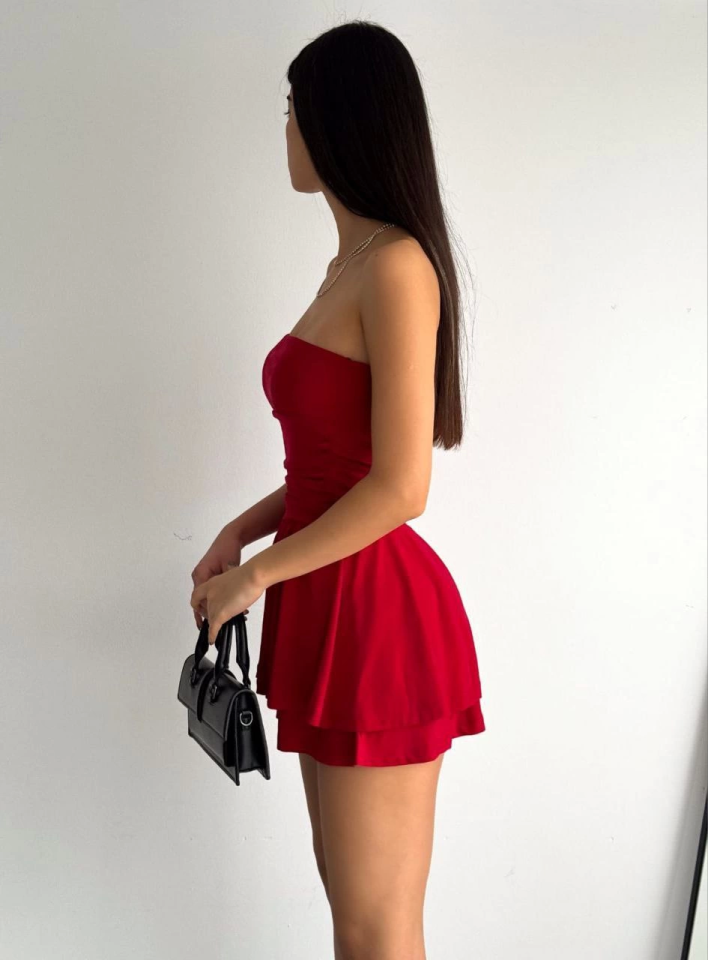 Straplez Sandy Kumaş Şortlu Prenses Etek Mini Kloş Elbise – Kırmızı