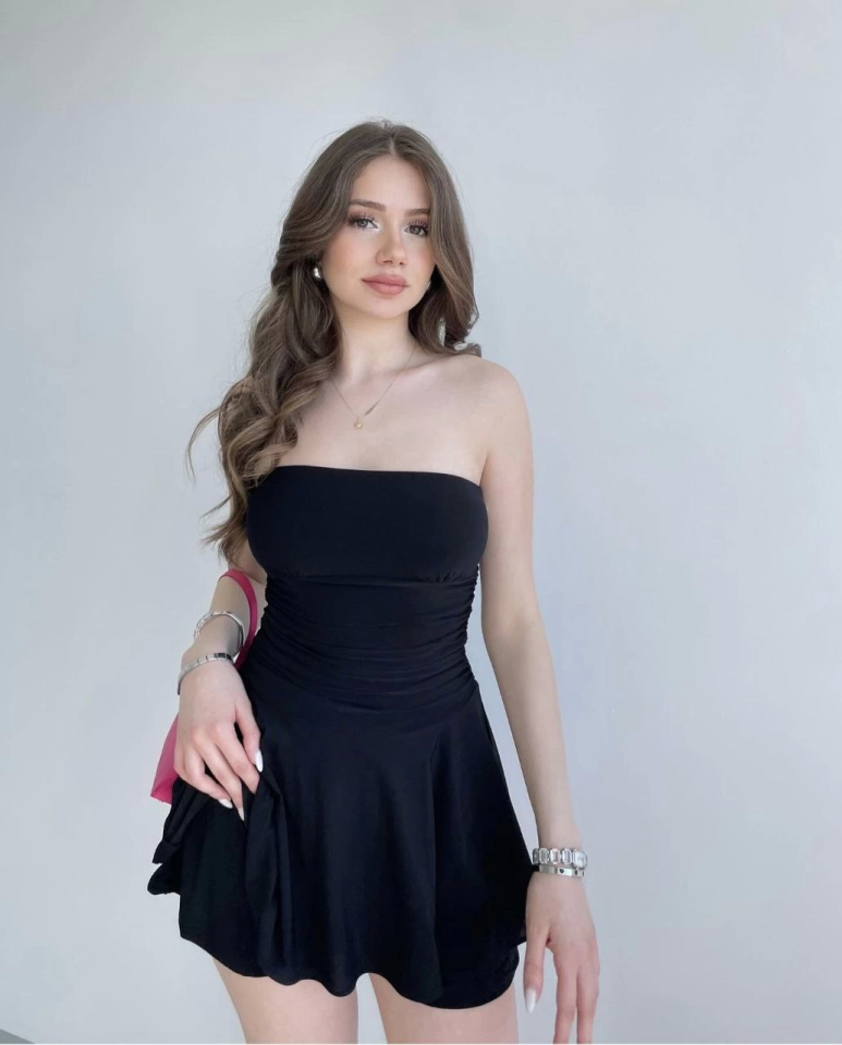 Straplez Sandy Kumaş Şortlu Prenses Etek Mini Klos Elbise- Siyah