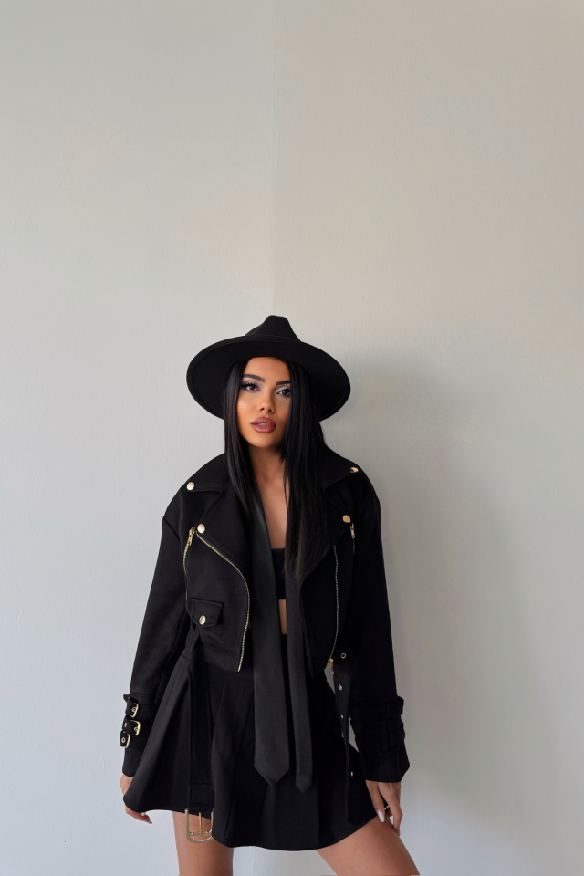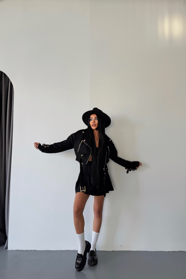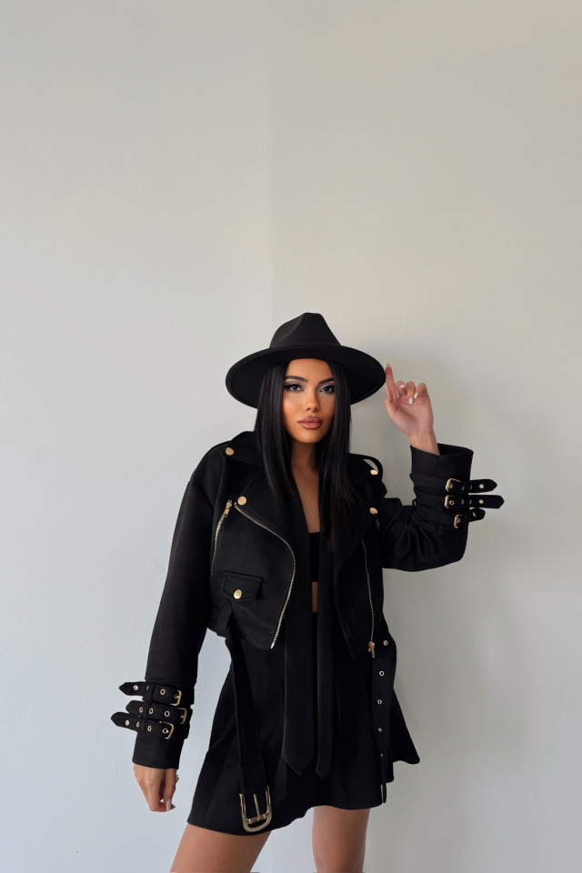 SÜET CROP CEKET KOL 3 KEMER DETAYLI – Siyah
