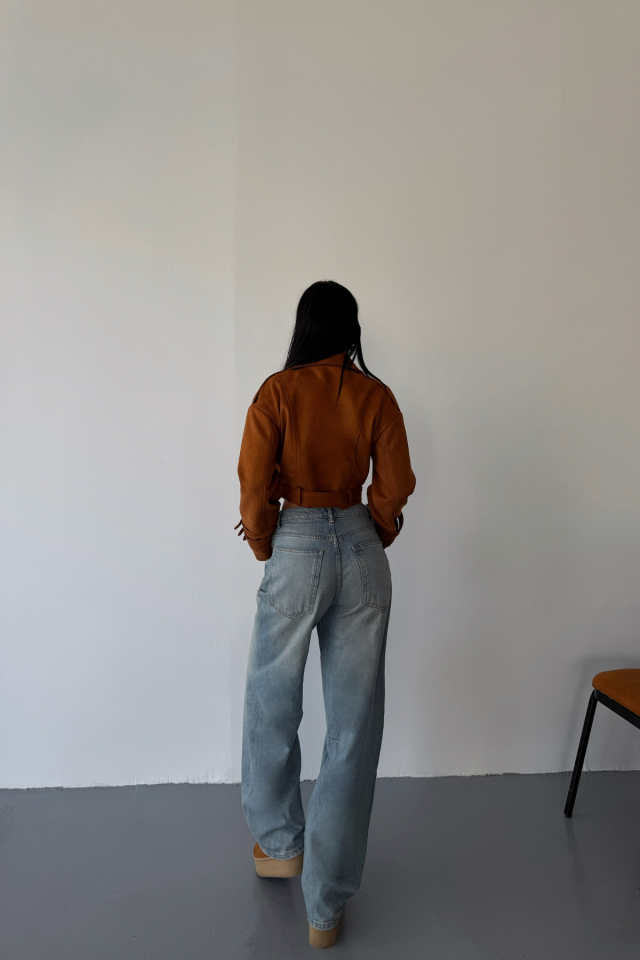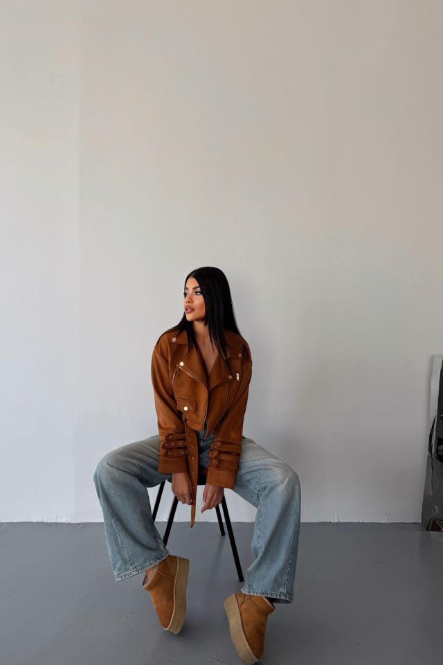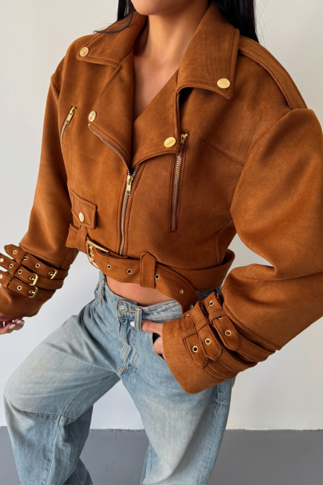 SÜET CROP CEKET KOL 3 KEMER DETAYLI – Taba