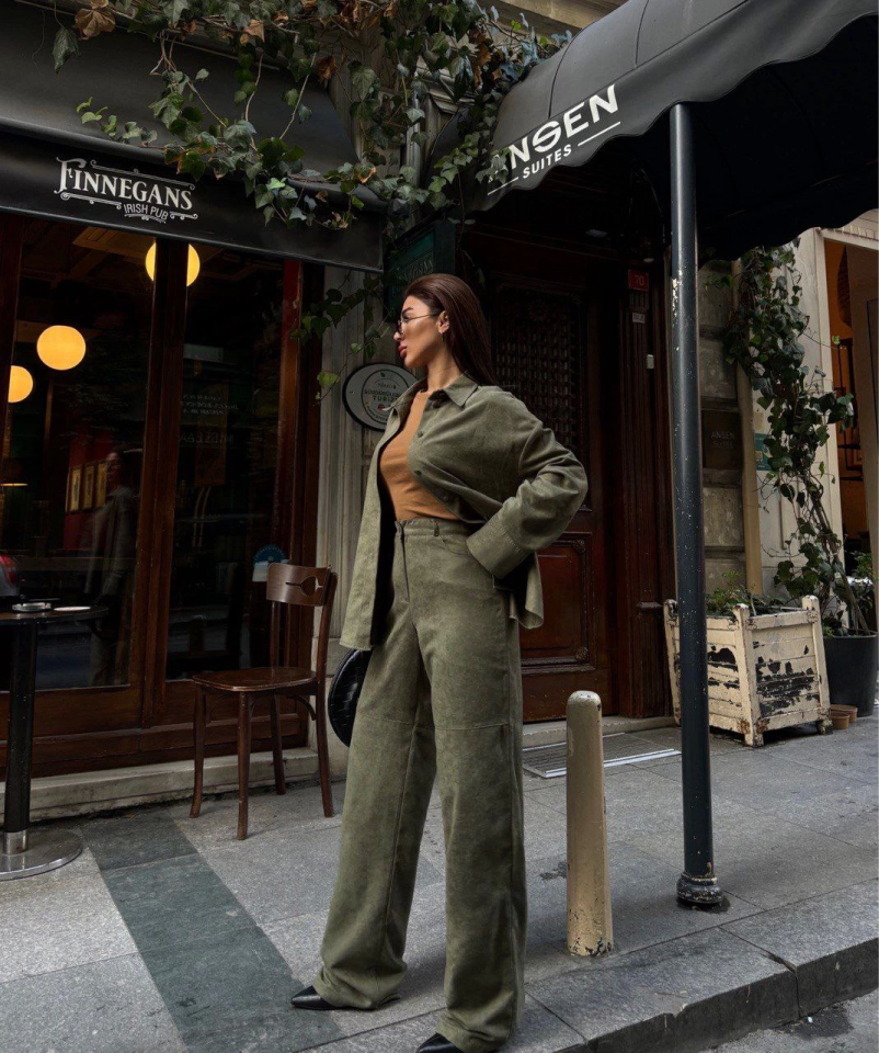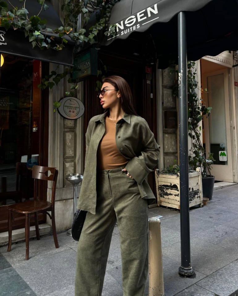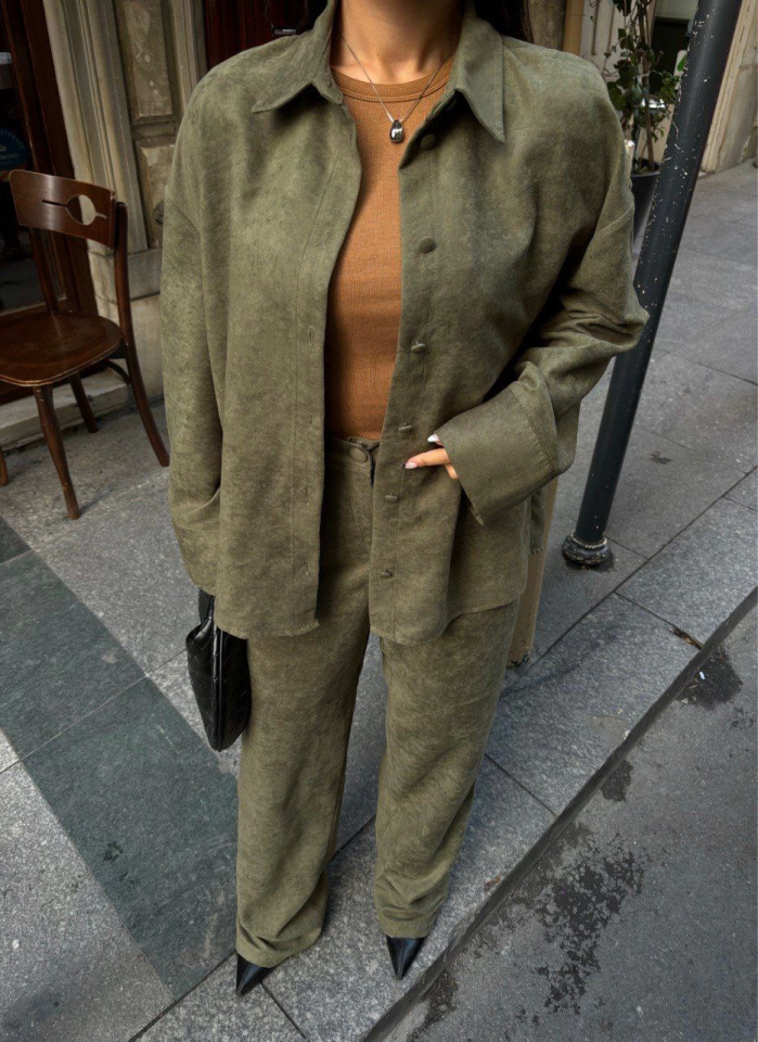 Süet Gömlek Palazzo Pantolon İkili Takım – Haki