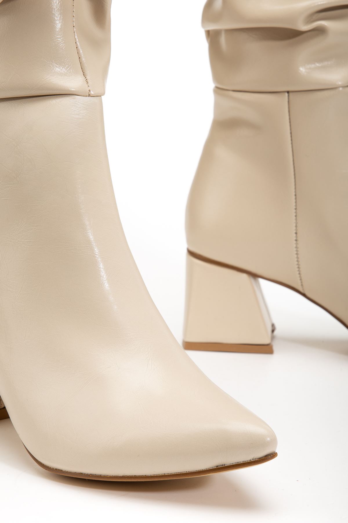 SYT-2002 Bej Kırışık Rugan Körüklü Kalın Topuklu Günlük Bayan Çizme