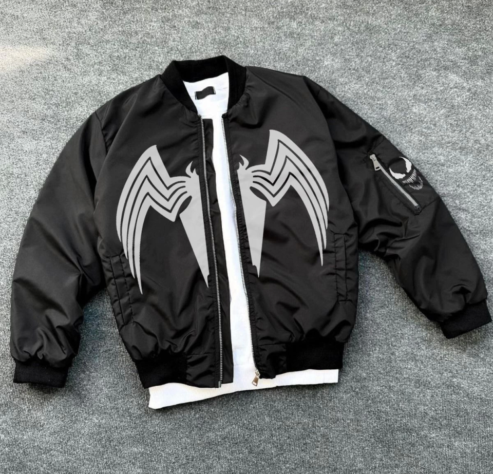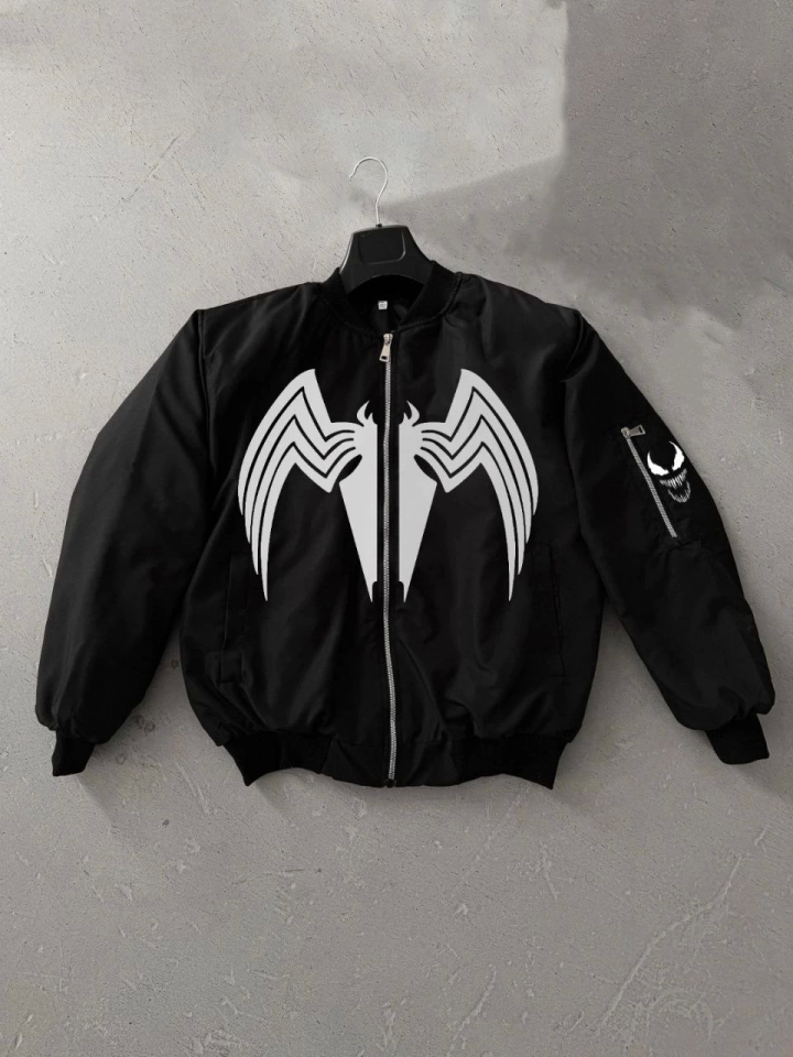 Tam Fermuarlı Uzun Kol Baskılı Bomber Ceket – Siyah