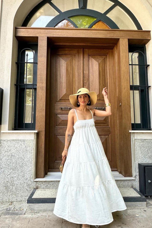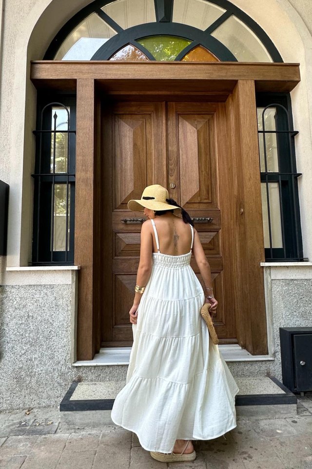Ekru Askılı Parçalı Müslin Elbise