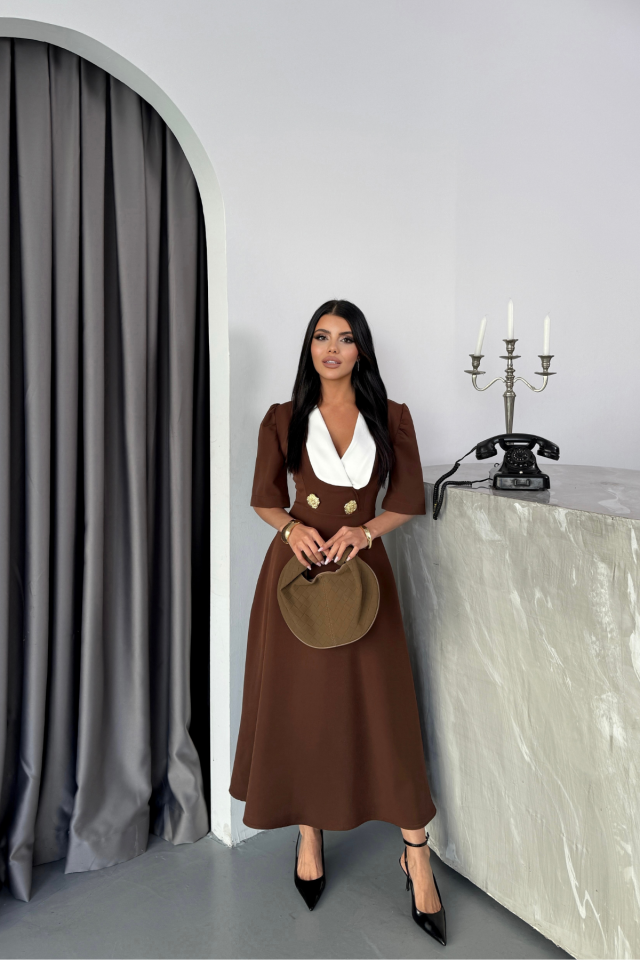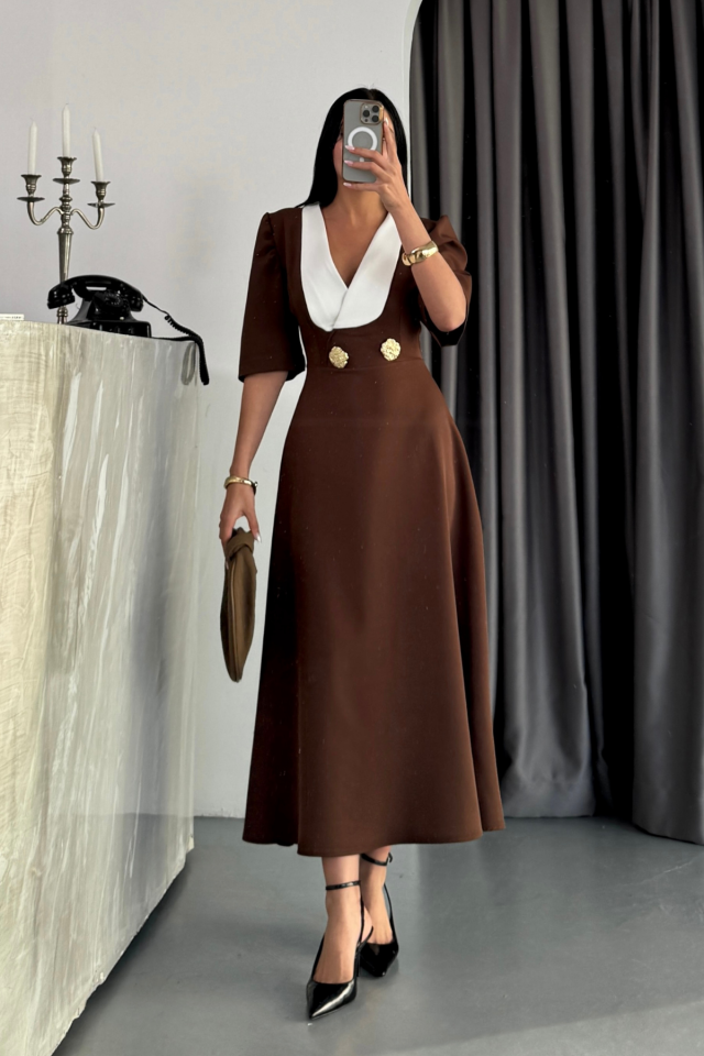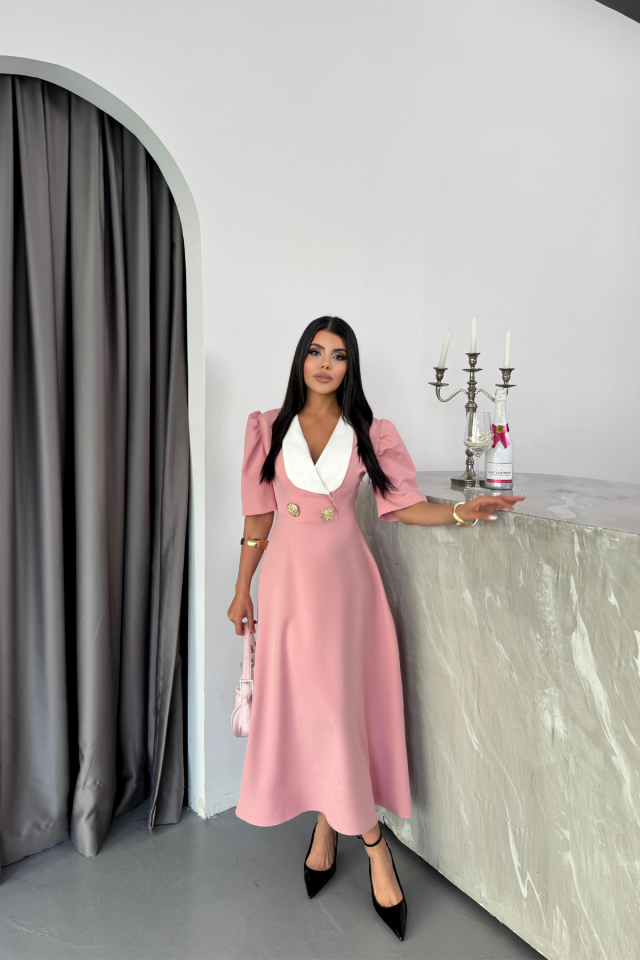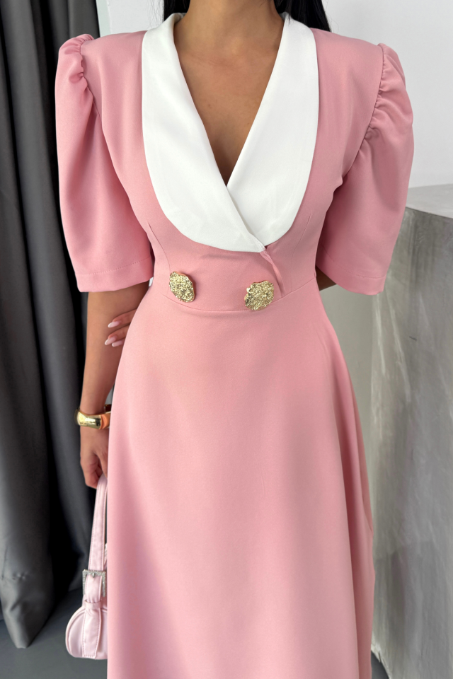 TASARIM ELBİSE CEKET YAKA GOLD DÜĞME DETAYLI KISA KOL – Pudra