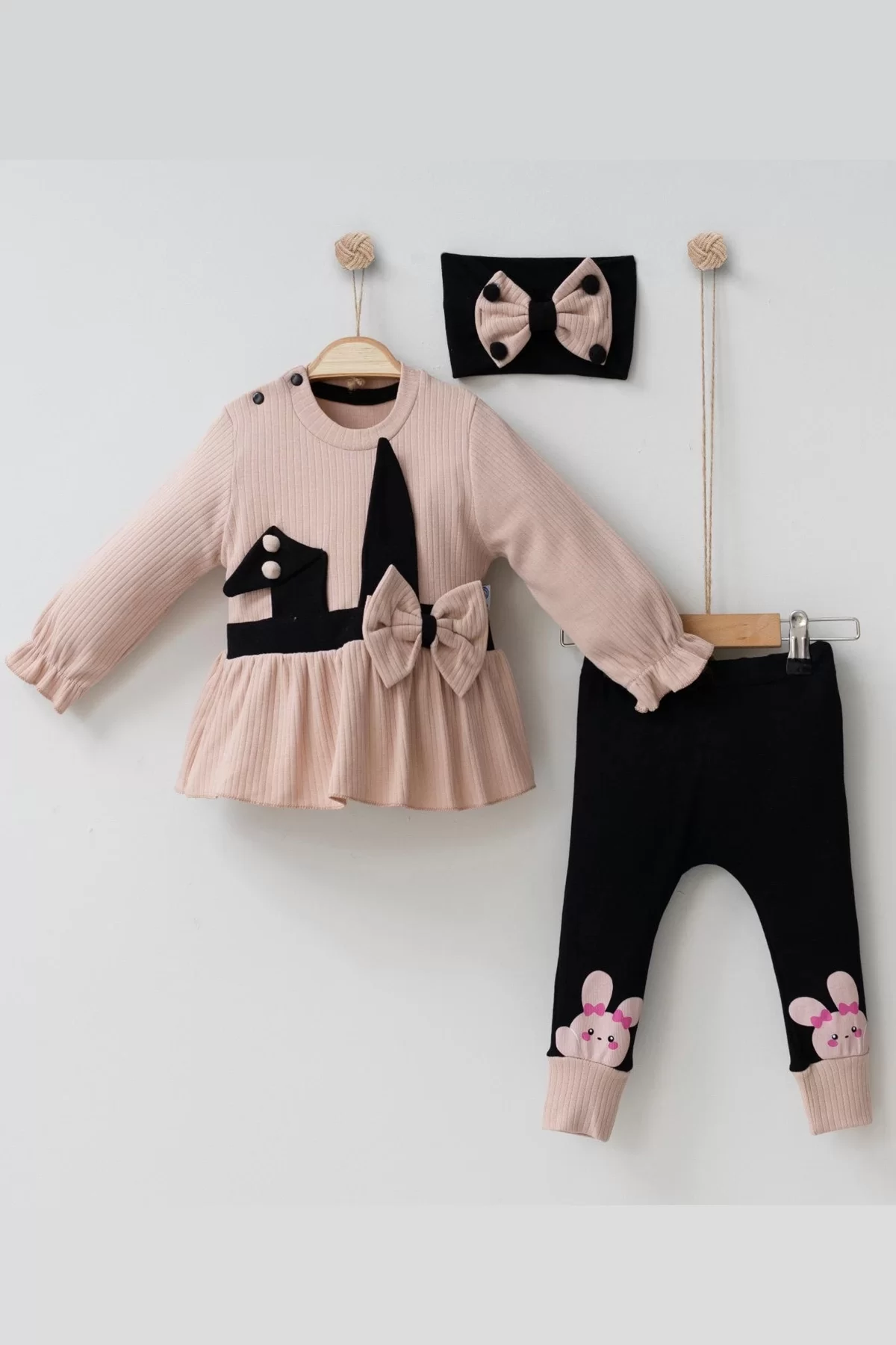 Tavşan Kulaklı Fiyonk Desenli Bandanalı Kız Bebek Takımı