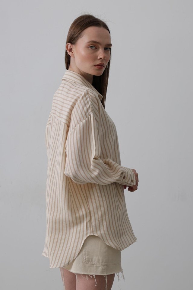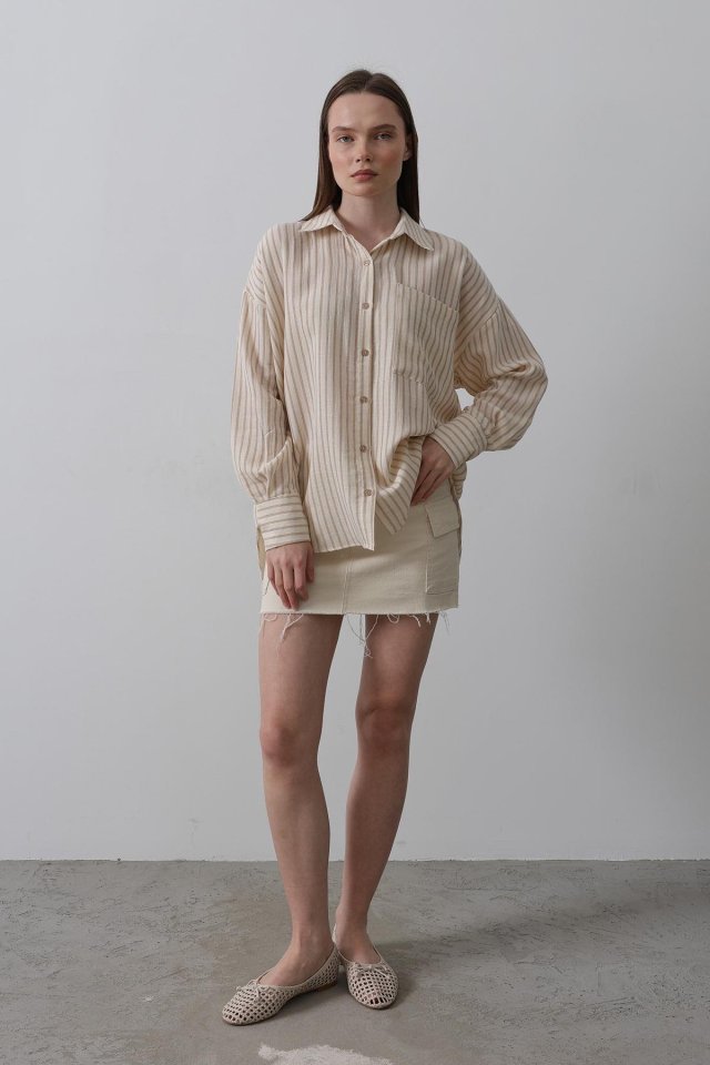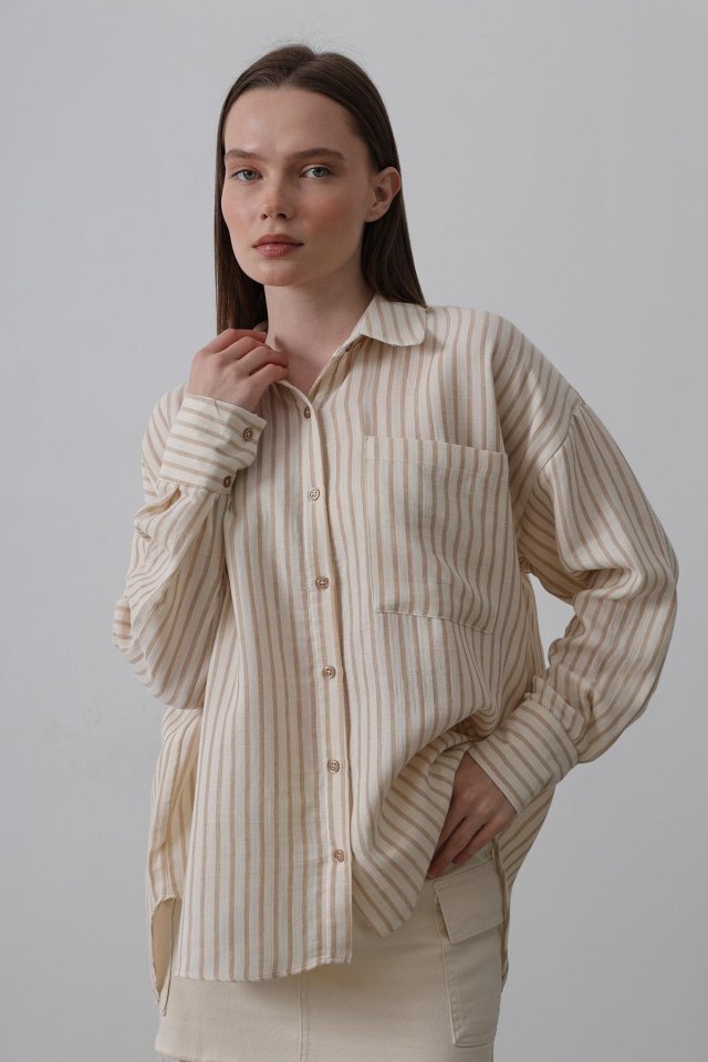 Tek Cep Çizgili Gömlek – Bej-Taba
