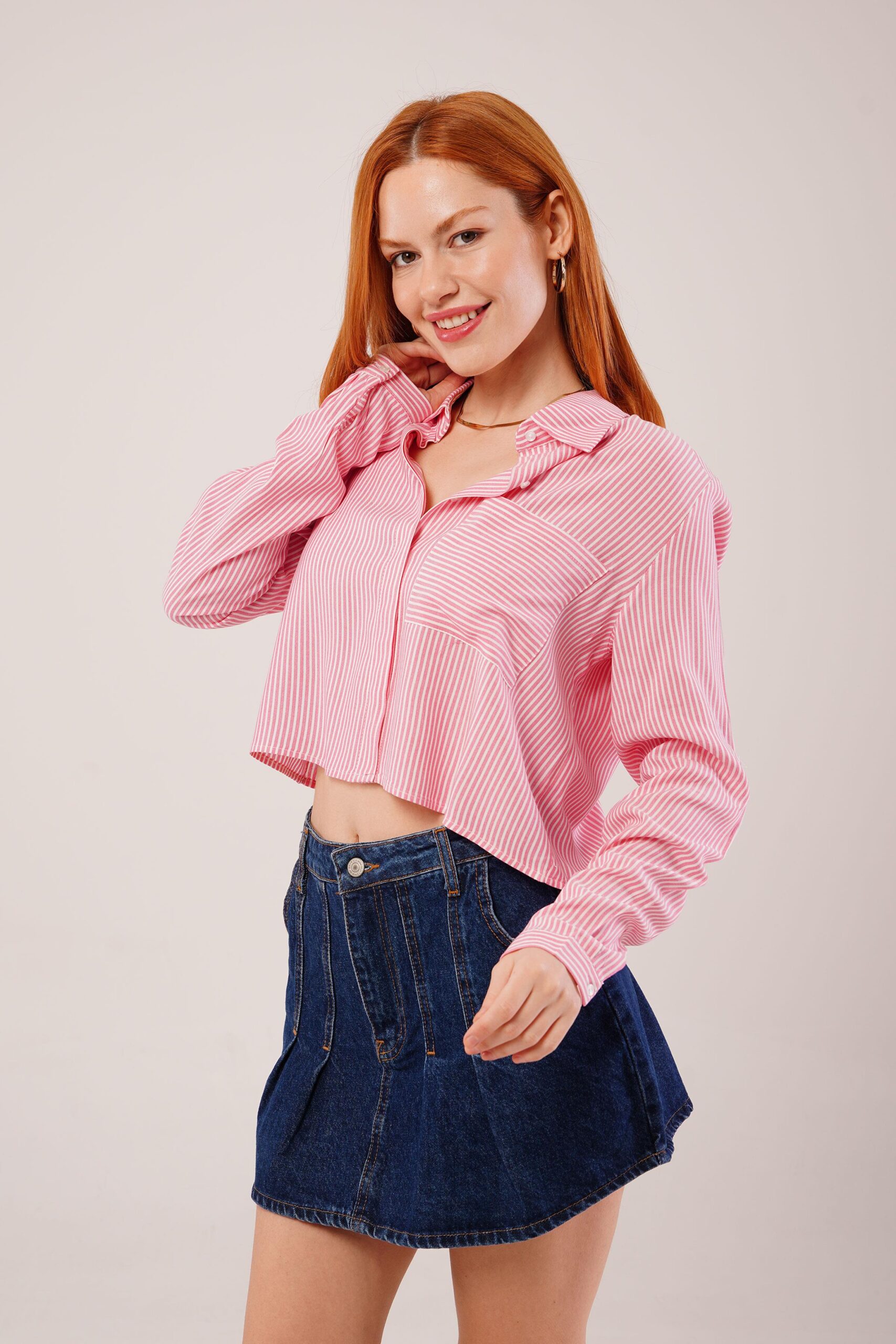 Tek Cep Çizgili Pembe Kısa Gömlek