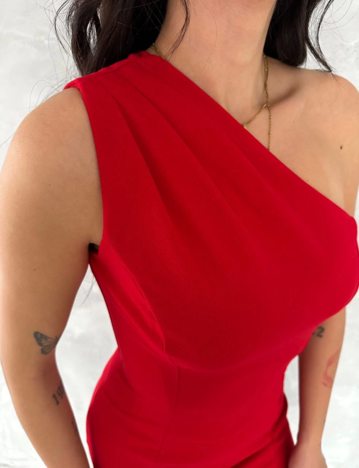 Tek Omuzlu Kolsuz Mini Boy Elbise – Kırmızı