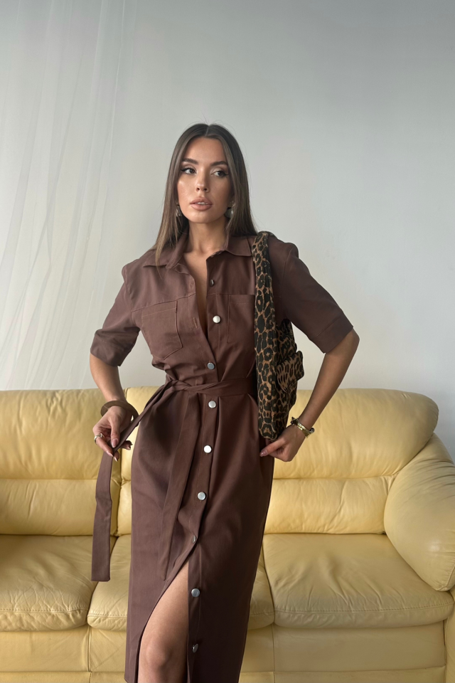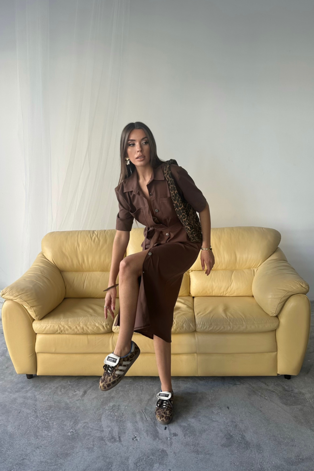 TENCEL ÖNDEN DÜĞMELİ KISA KOL ELBİSE – Kahverengi