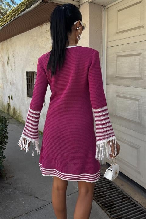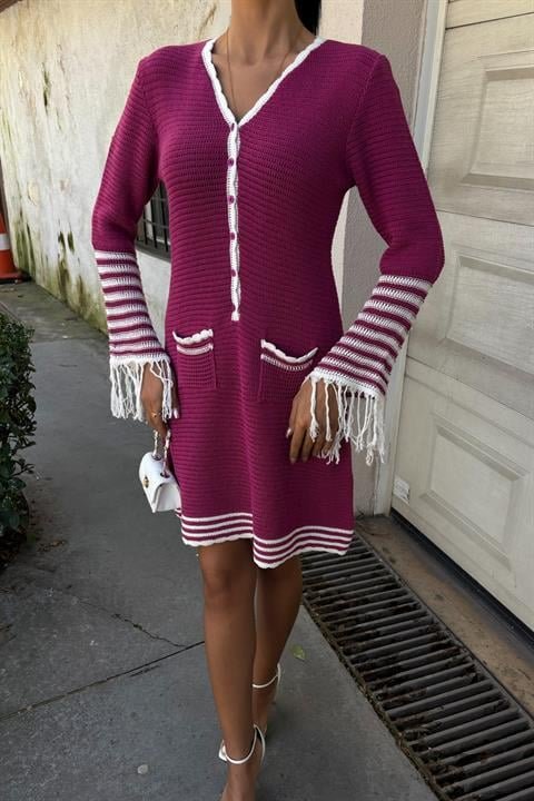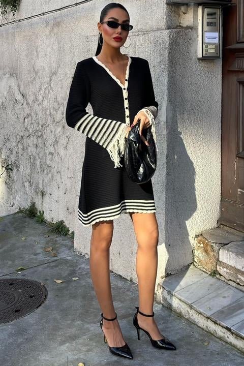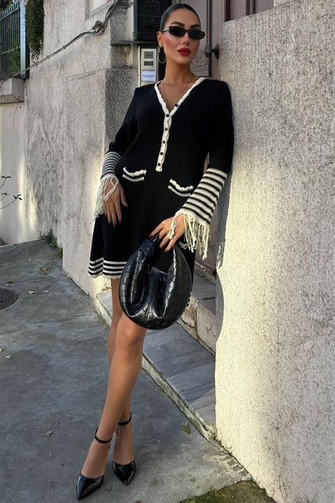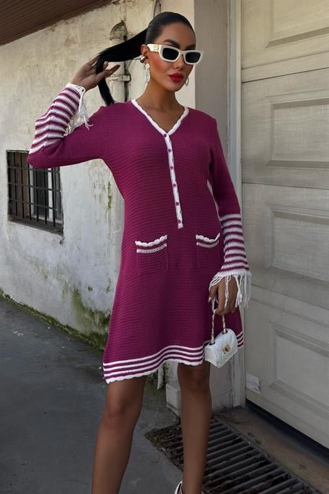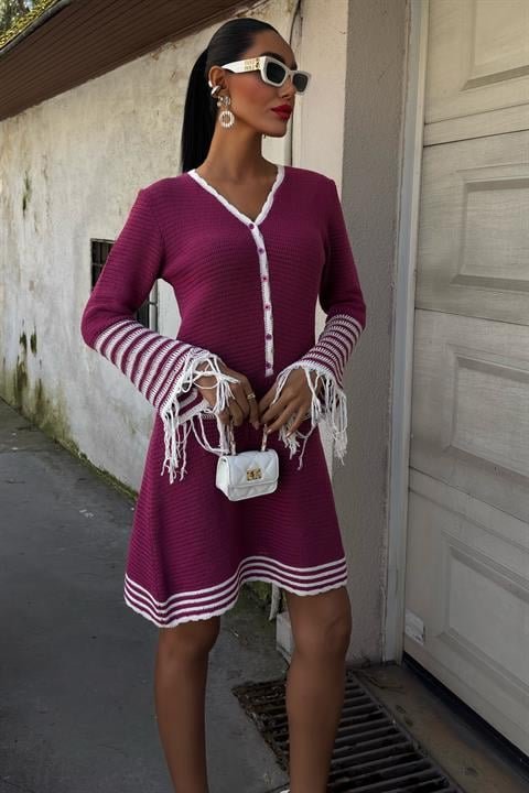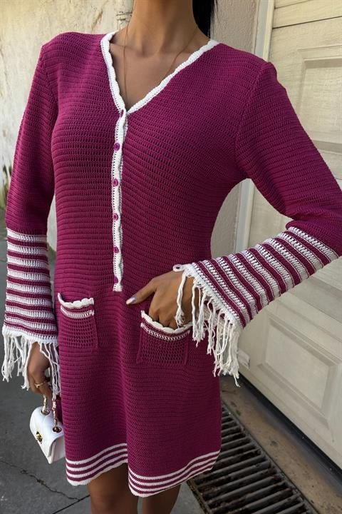 Triko Kolları Püsküllü Düğmeli Elbise 2849