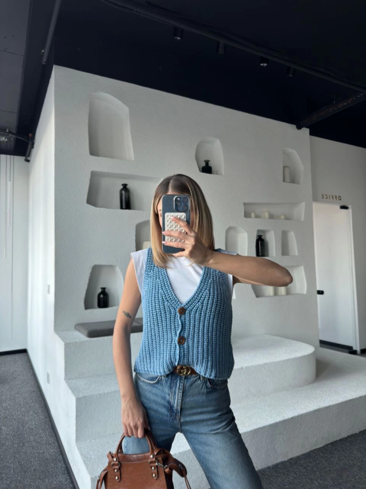 Triko Kolsuz Düğmeli Yelek – Mavi