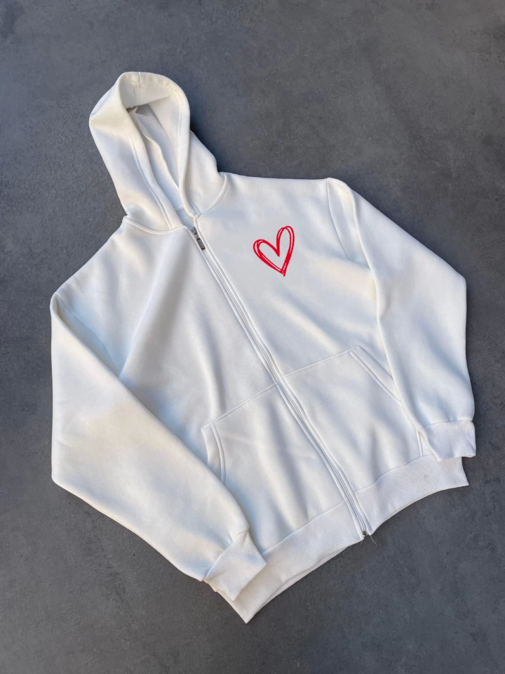 Üç İplik Baskılı Fermuarlı Kapşonlu Hırka – Beyaz