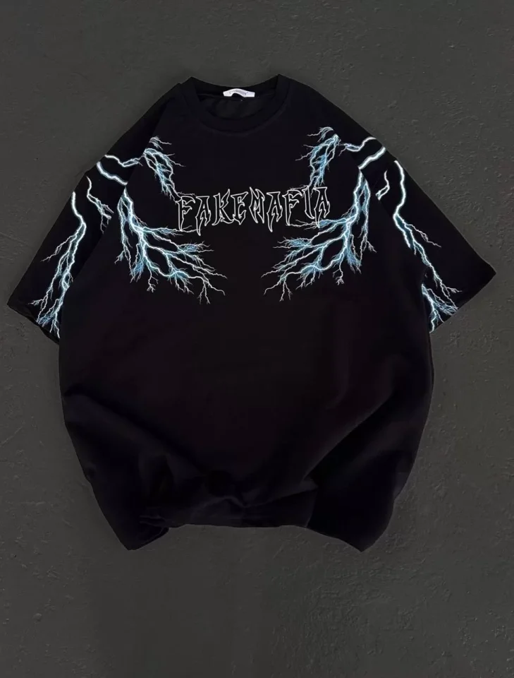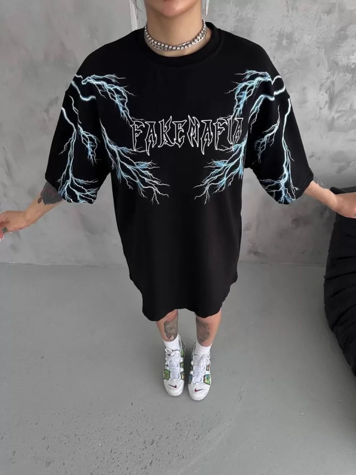 Unisex Bisiklet Yaka Baskılı Oversize T-Shirt – Siyah