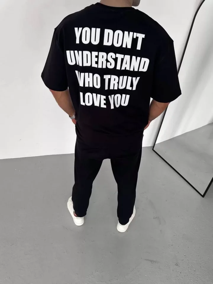 Unisex Bisiklet Yaka Baskılı Oversize T-Shirt – Siyah
