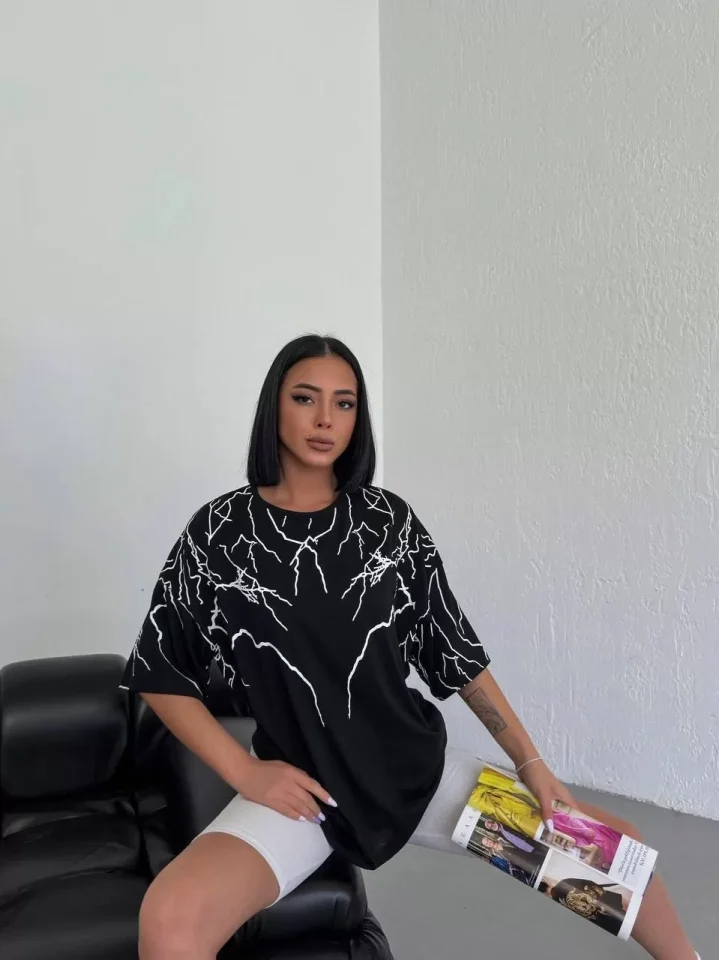 Unisex Bisiklet Yaka Baskılı Oversize T-Shirt – Siyah